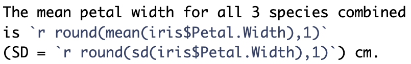• With markdown you can also report R code output inline with the text instead of using a chunk.