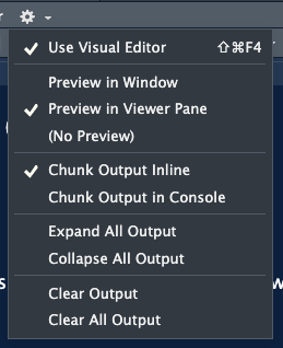 HTML output format (default)KnitrUse visual markdown editorCreate
