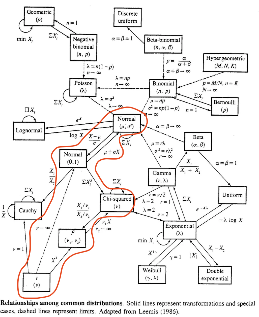 There is a big, scary (but fun!) infographic at the end of a famous stat textbook (Casella and Berger) that shows all the connections between distributions: