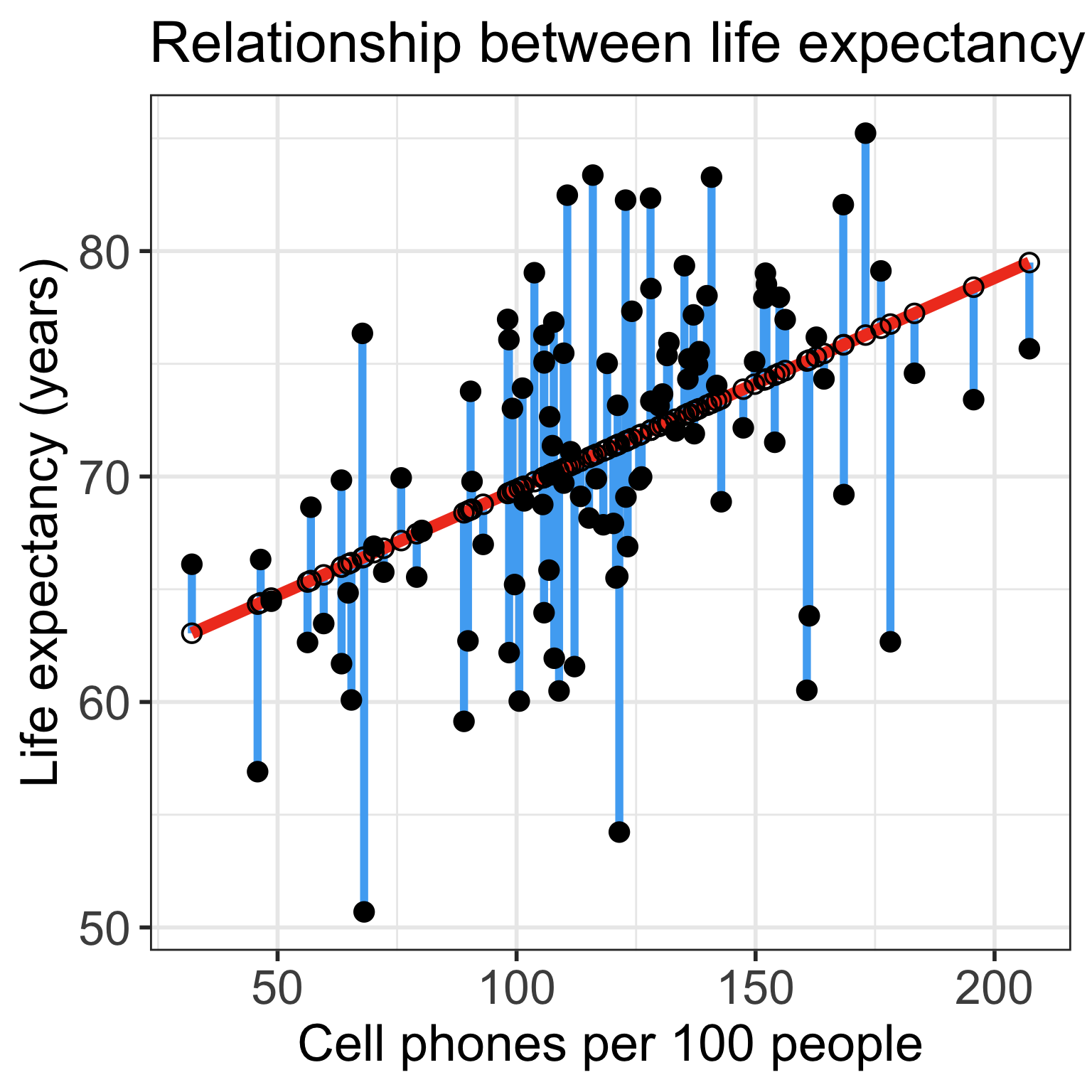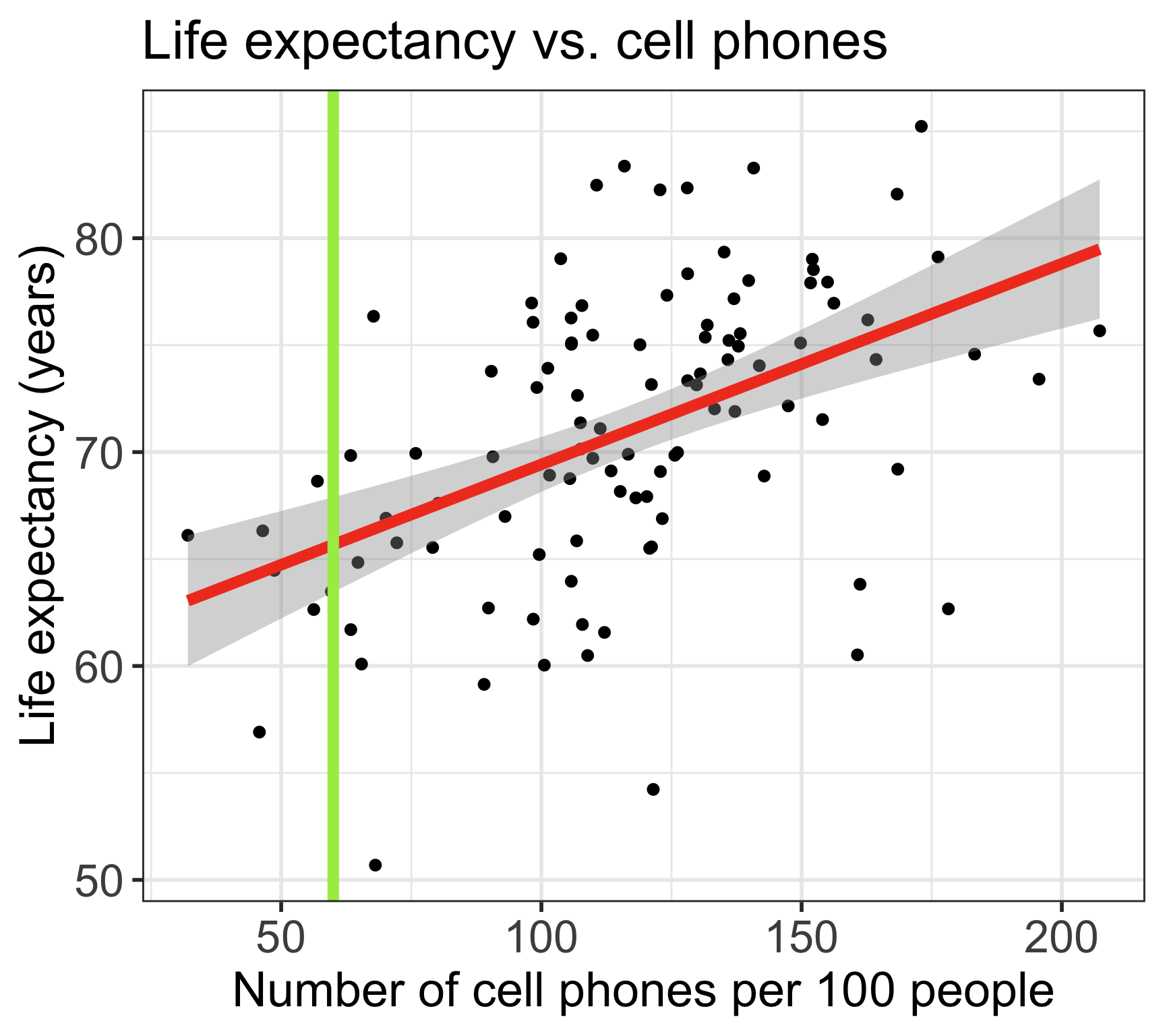 \[\widehat{\textrm{life expectancy}} = 60.041 + 0.094 \cdot \textrm{cell phones} \]