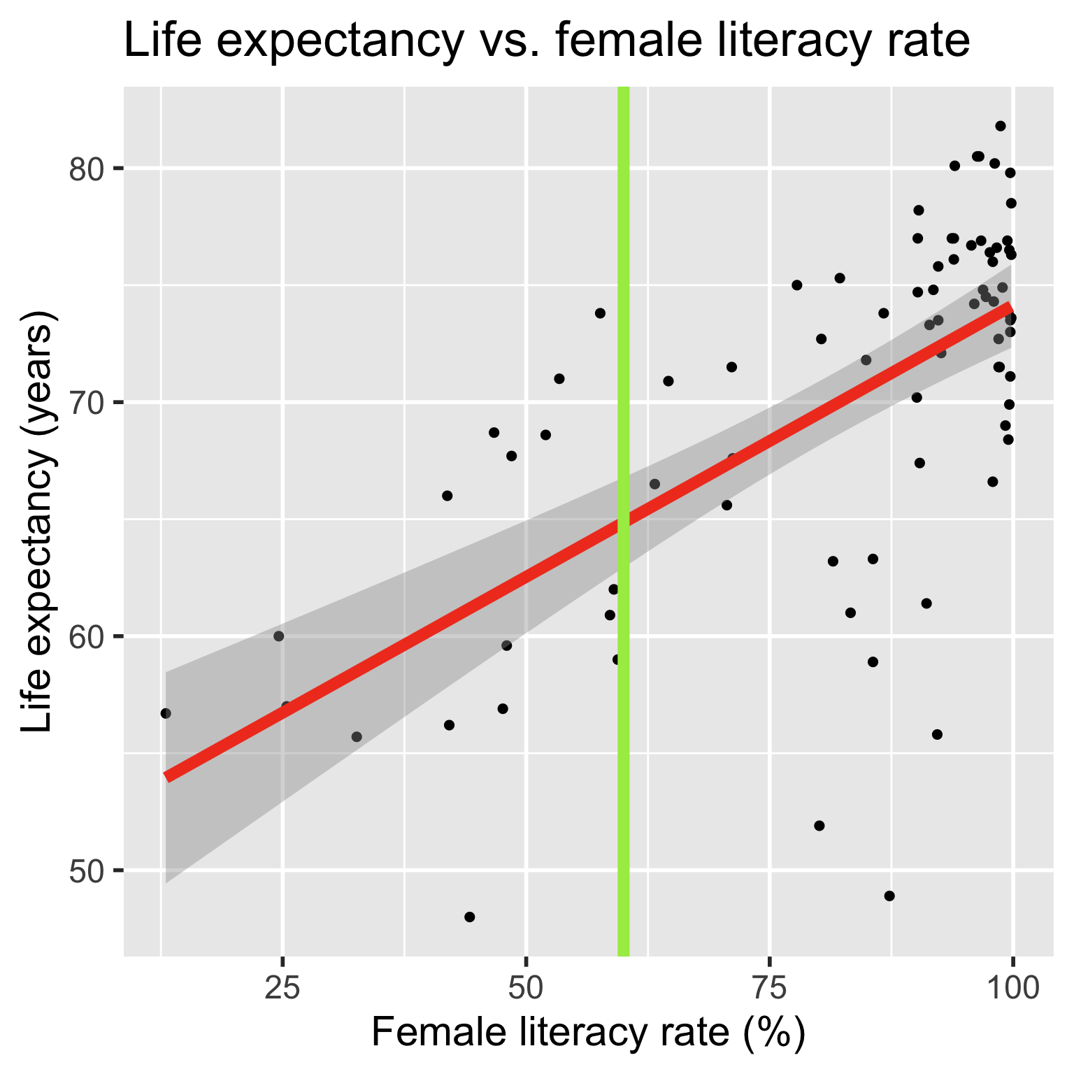 \[\widehat{\textrm{life expectancy}} = 50.9 + 0.232 \cdot 60 = 64.82\]