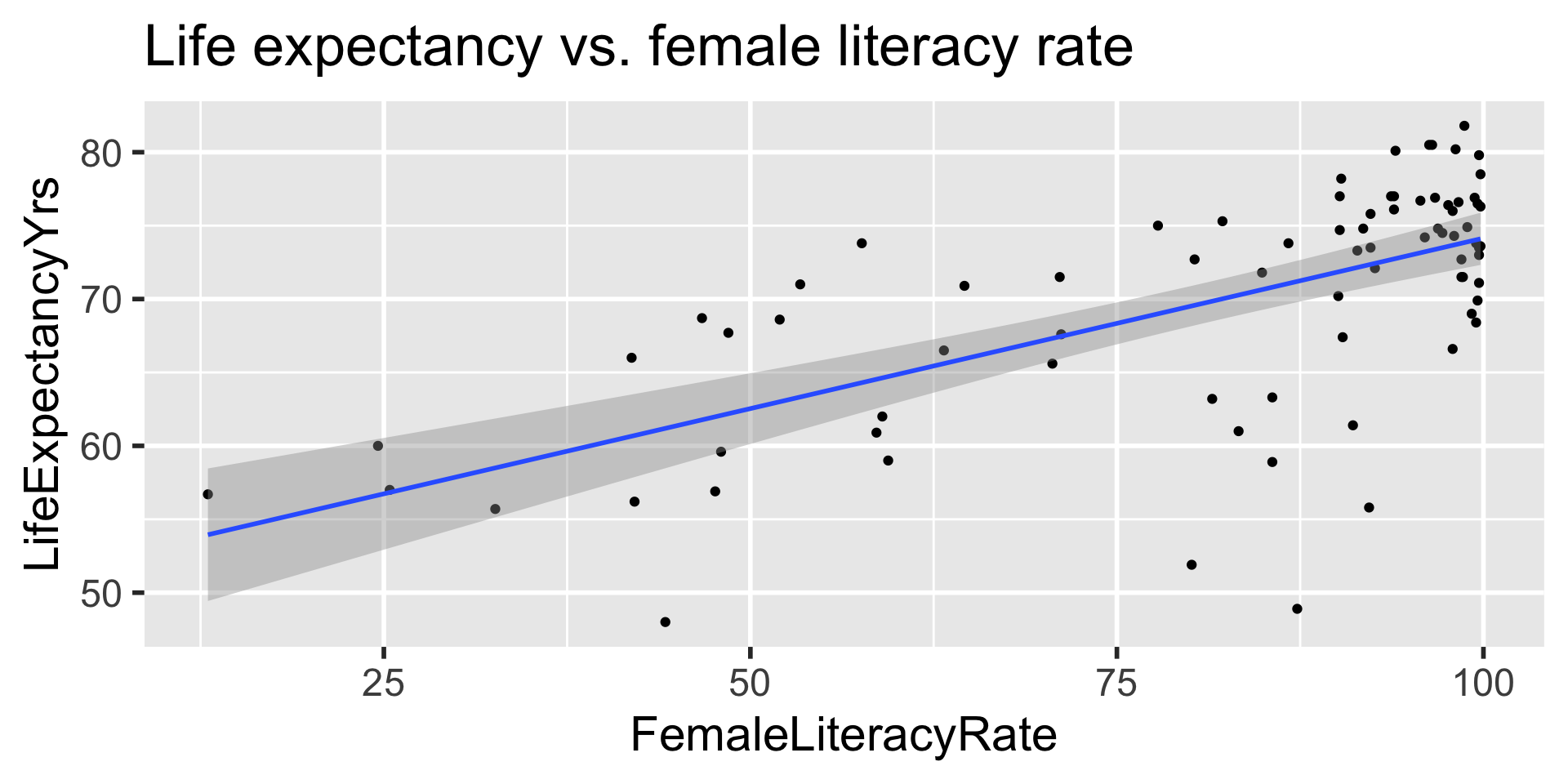 lm(formula = LifeExpectancyYrs ~ FemaleLiteracyRate, data = .)