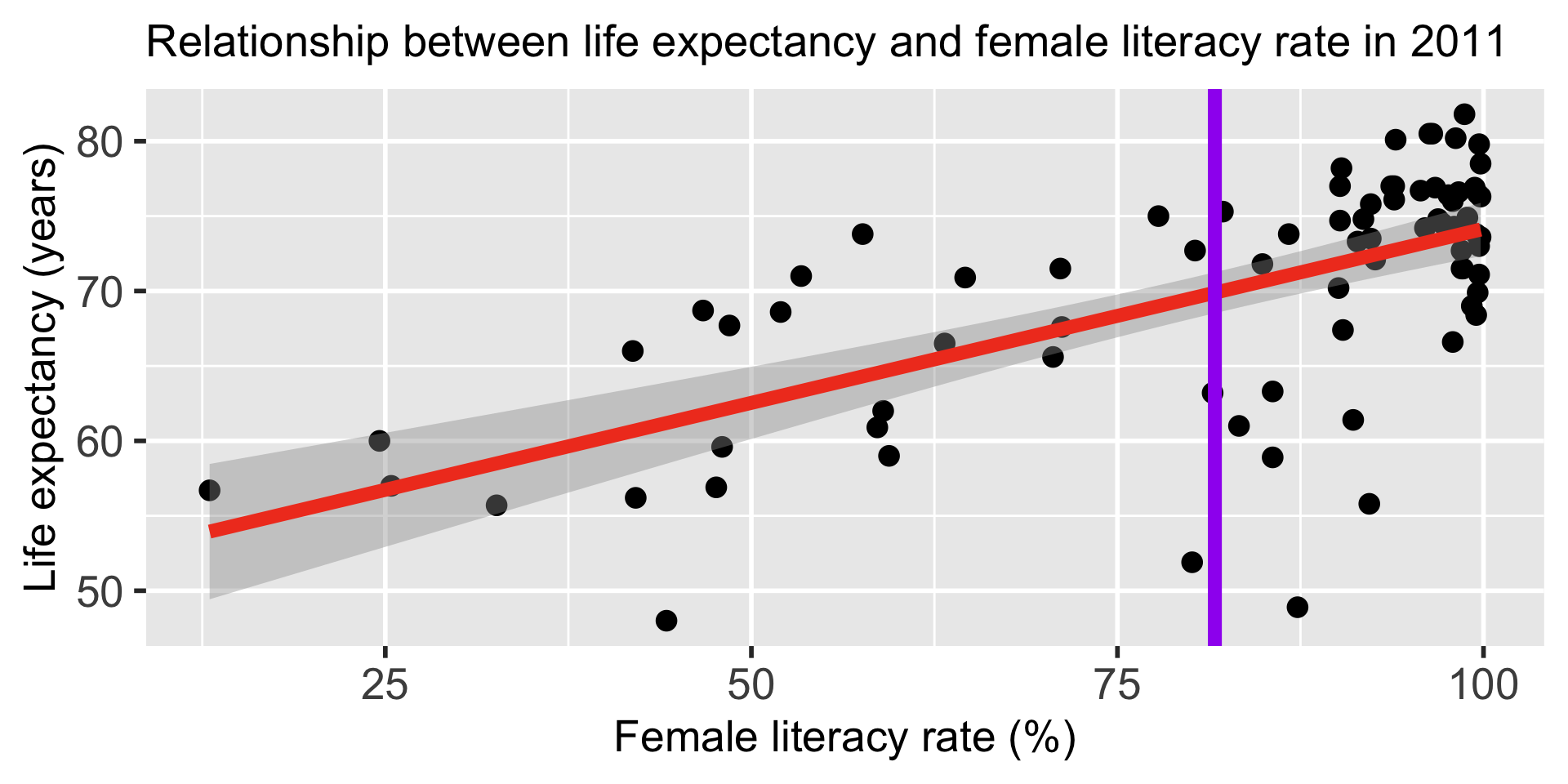 \[\widehat{\textrm{life expectancy}} = 50.9 + 0.232 \cdot \textrm{female literacy rate} \]