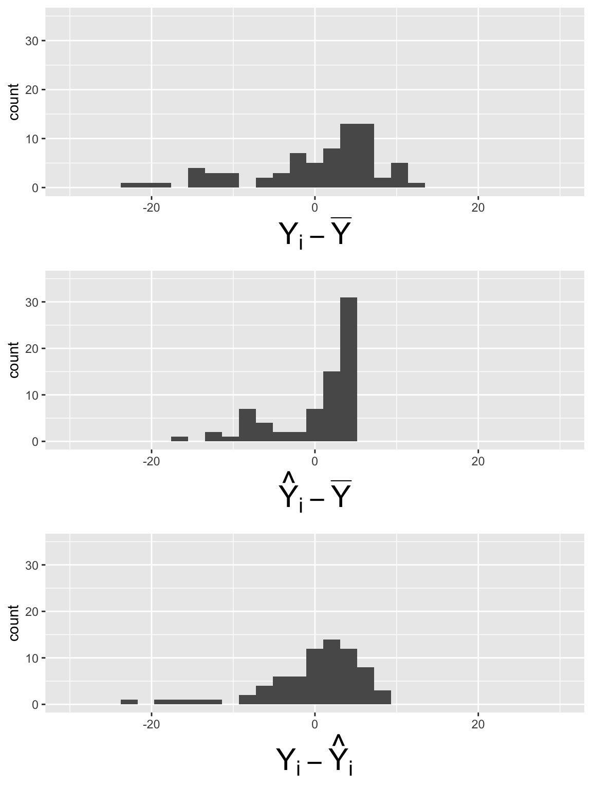 SSE_dev = aug_slr1$.resid)SSY_plot = ggplot(SS_dev_slr, aes(SSY_dev)) + geom_histogram() + xlim(-30, 30) + ylim(0, 35) + xlab(expression(Y[i] - bar(Y)))