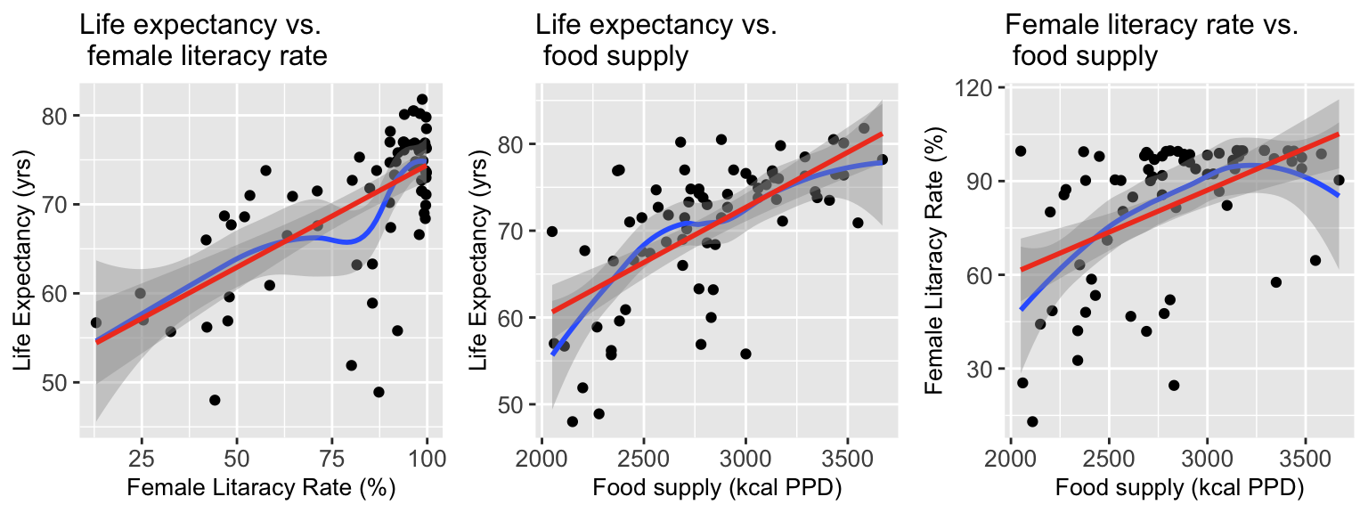 \[\begin{aligned} \text{Life expectancy} & = \beta_0 + \beta_1 \text{Female literacy rate} + \beta_2 \text{Food supply} + \epsilon \\ \text{LE} & = \beta_0 + \beta_1 \text{FLR} + \beta_2 \text{FS} + \epsilon \end{aligned}\]