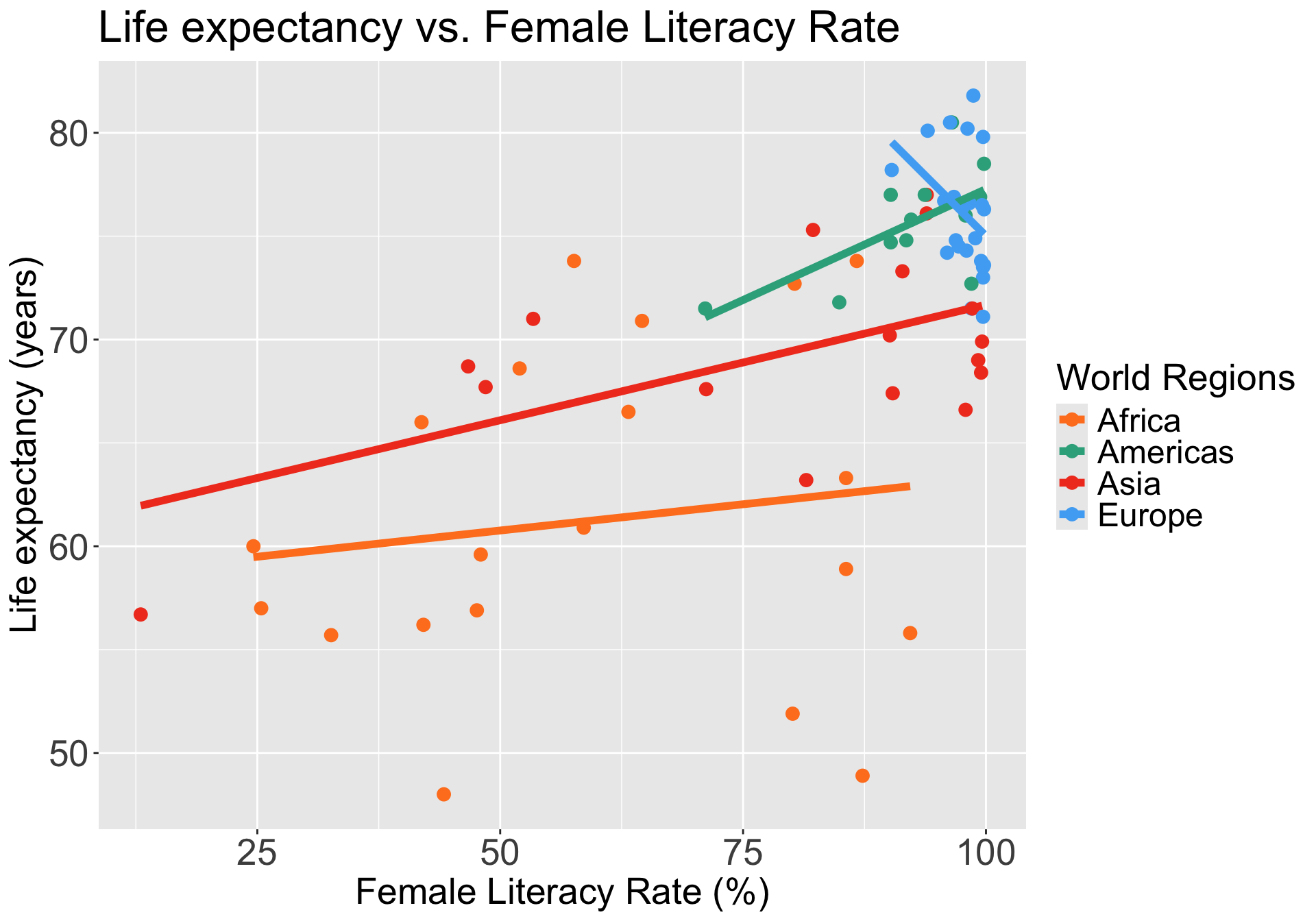 • Questions of interest: Does the effect of female literacy rate on life expectancy differ depending on world region?