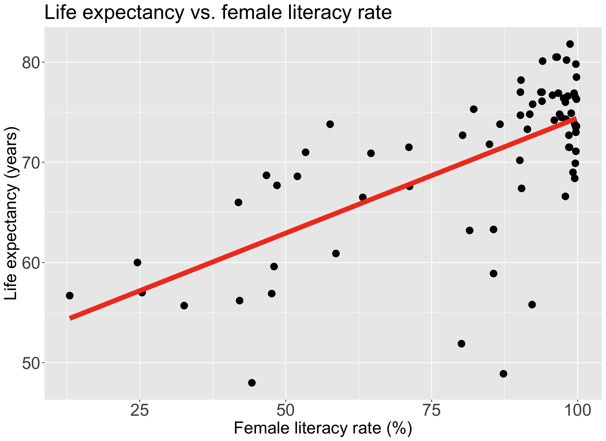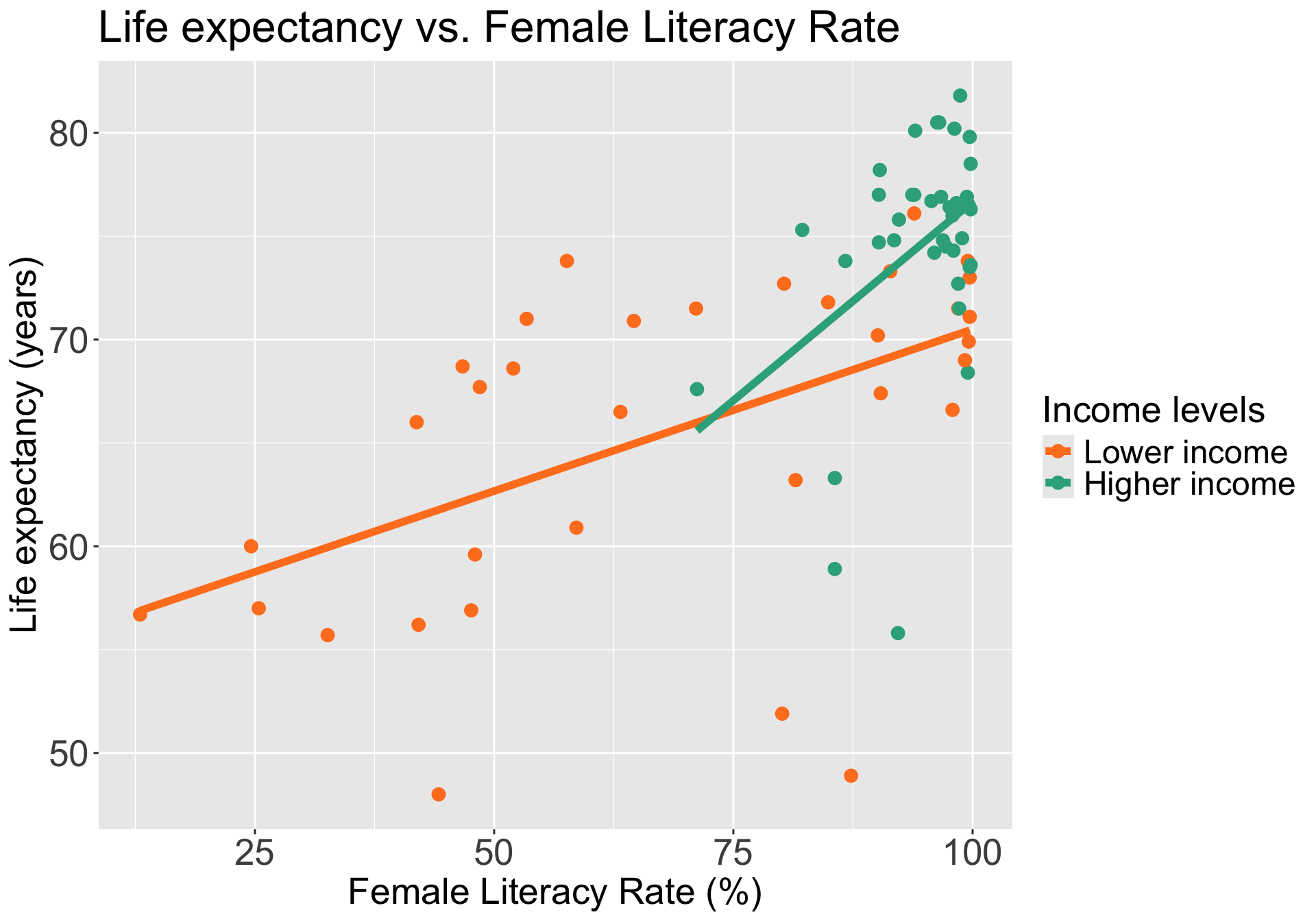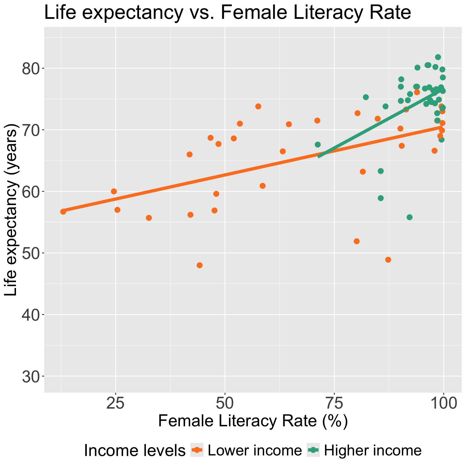 • We can start by visualizing the relationship between life expectancy and female literacy rate by income level
