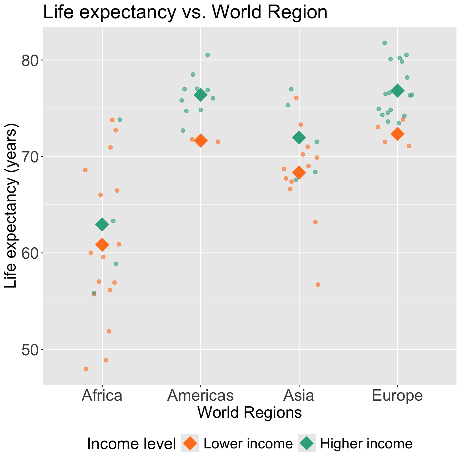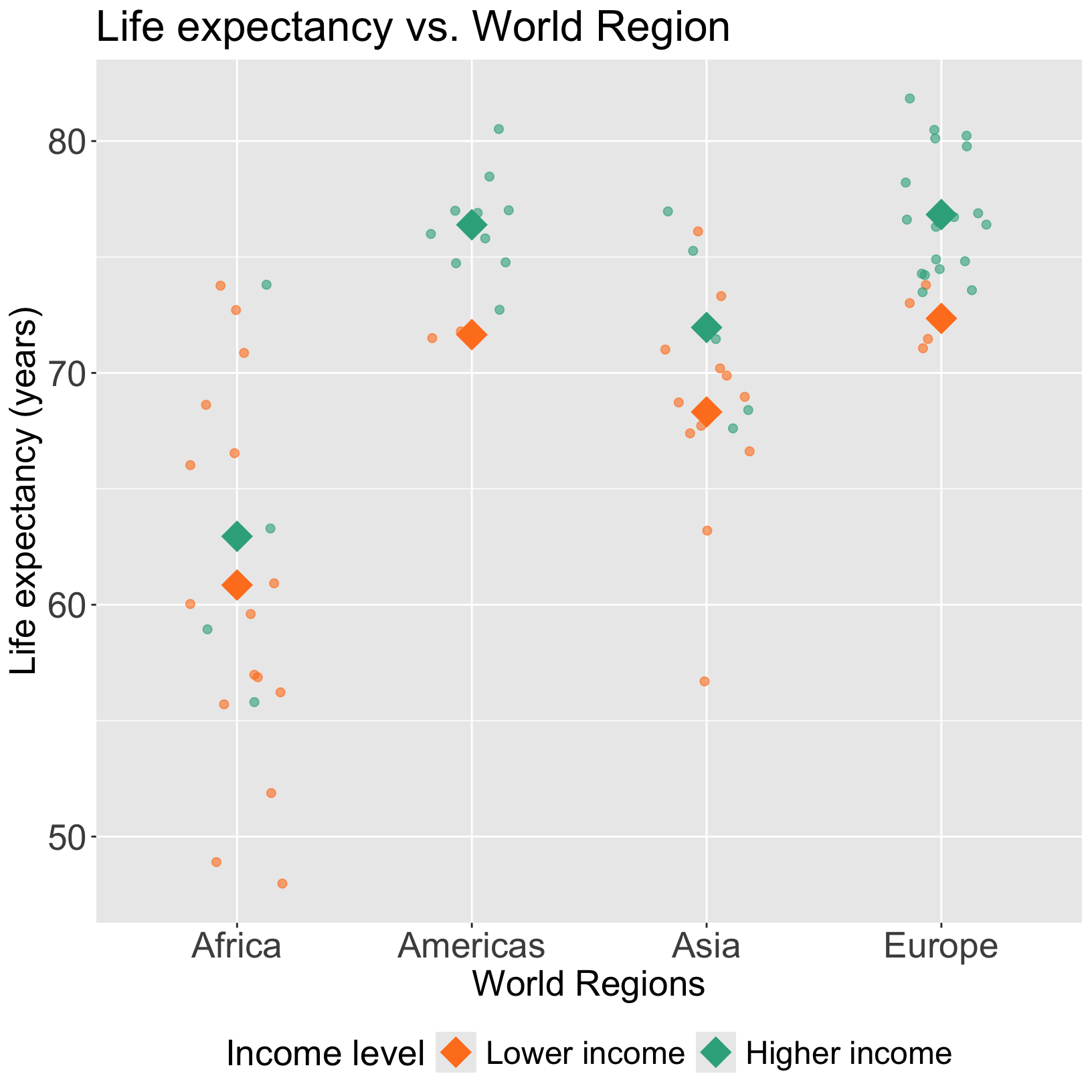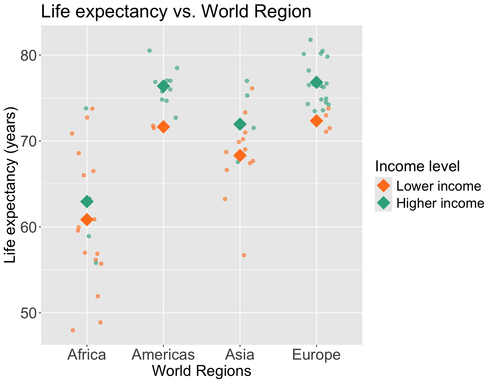 We can start by visualizing the relationship between life expectancy and world region by income level