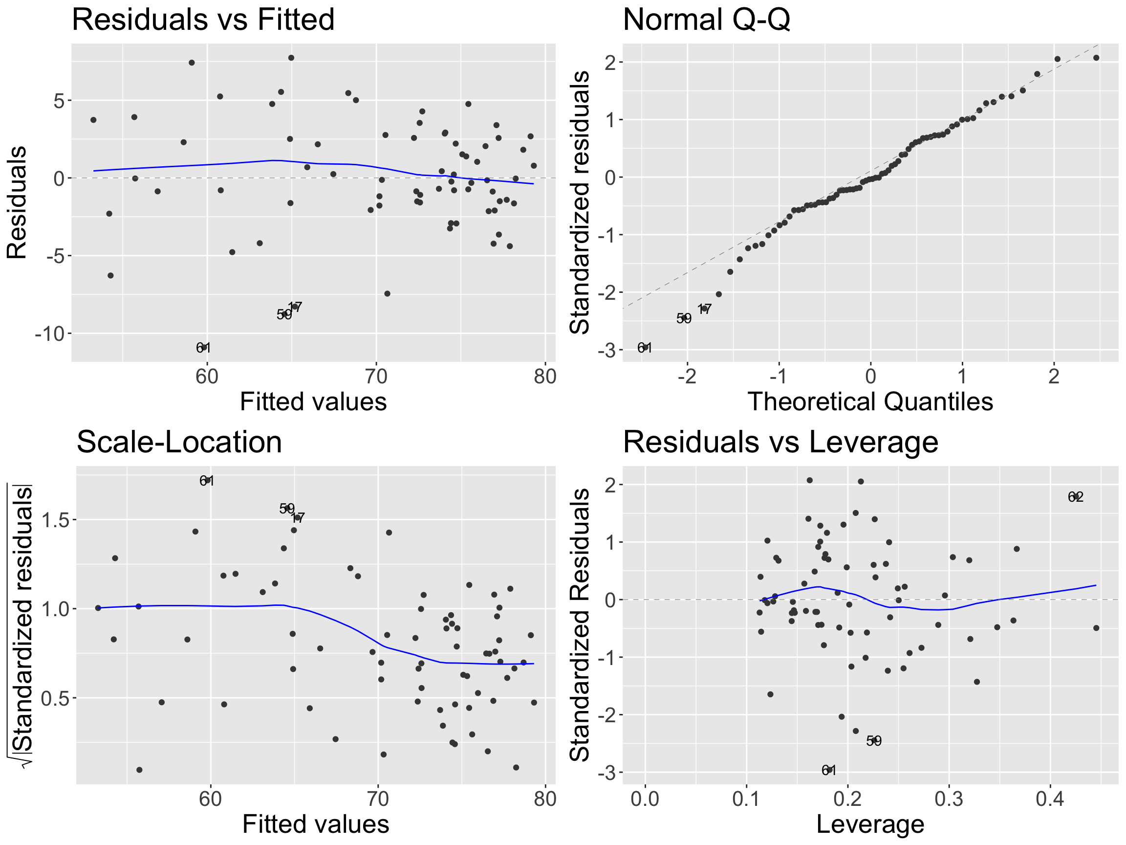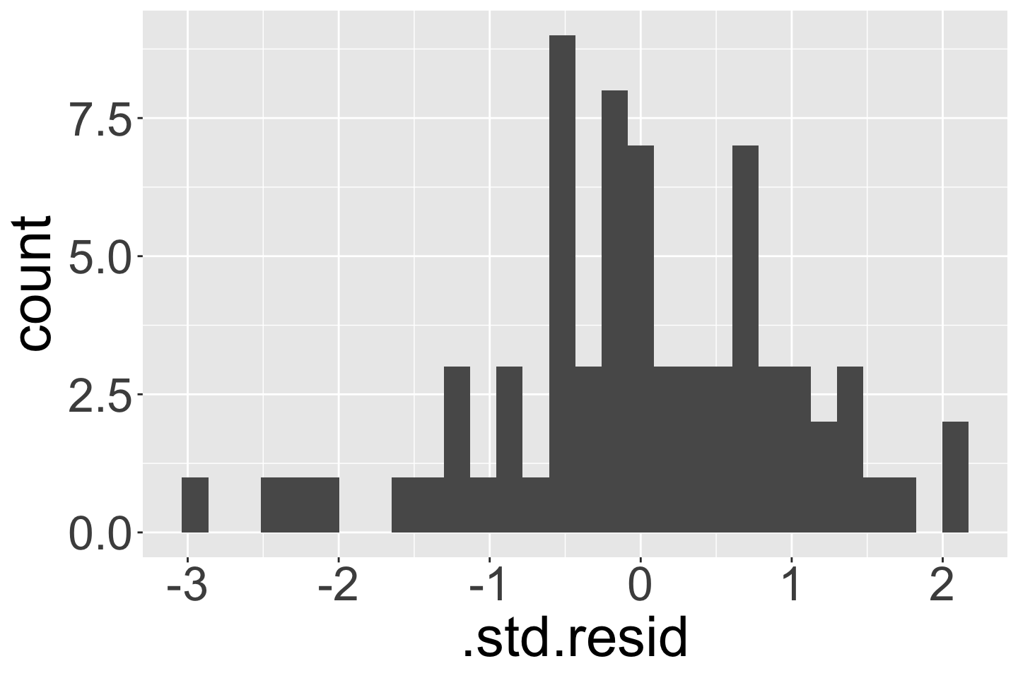 • cook’s distance (.cooksd), \(\widehat{Y}_i\) (.fitted), leverage (.hat), residuals (.resid), std residuals (.std.resid)