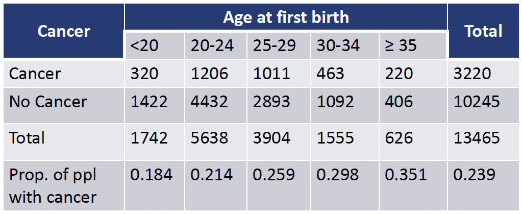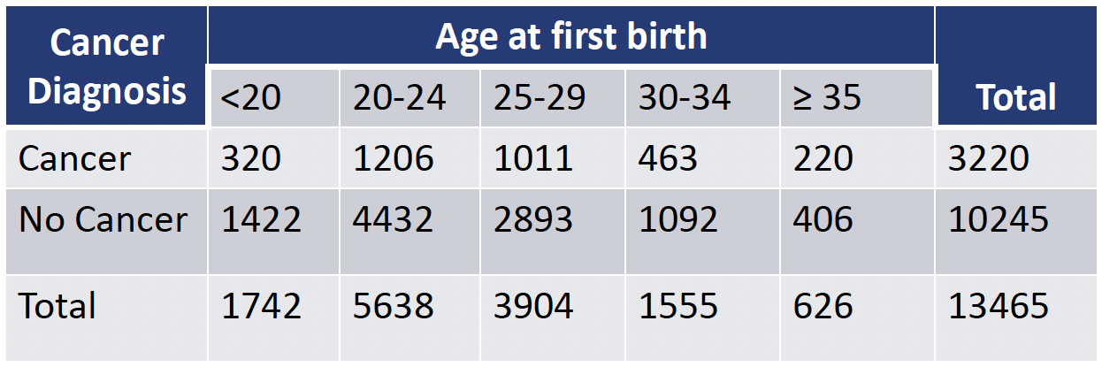 Let’s say we are interested in learning the association between the development of breast cancer and age at first birth. Our first step is typically to present the observed data: