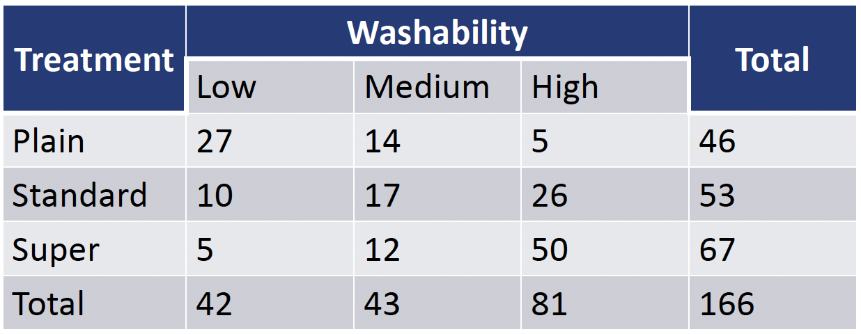 The treatments studies where no treatment (plain water), the standard treatment, and a double dose of the standard treatment, called super. Washability was measured as low, medium and high.