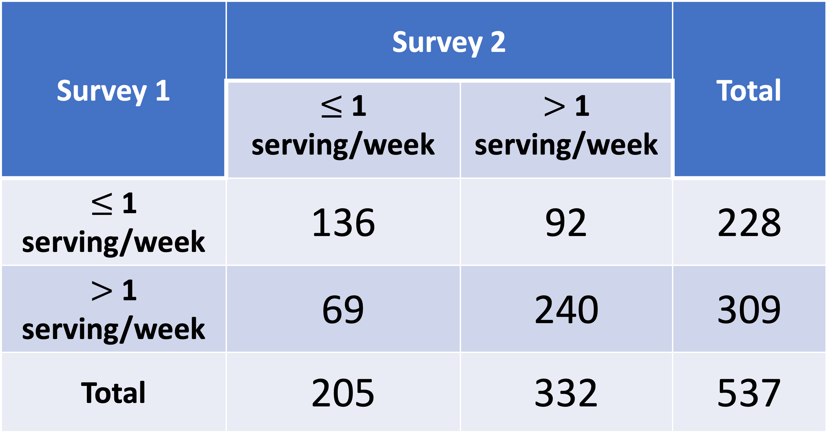 A diet questionnaire was mailed to 537 female American nurses on two separate occasions several months apart. The questions asked included the quantities eaten of more than 100 separate food items. The data from the two surveys for the amount of beef consumption are presented in the below table. How can reproducibility of response for the beef-consumption data be quantified?