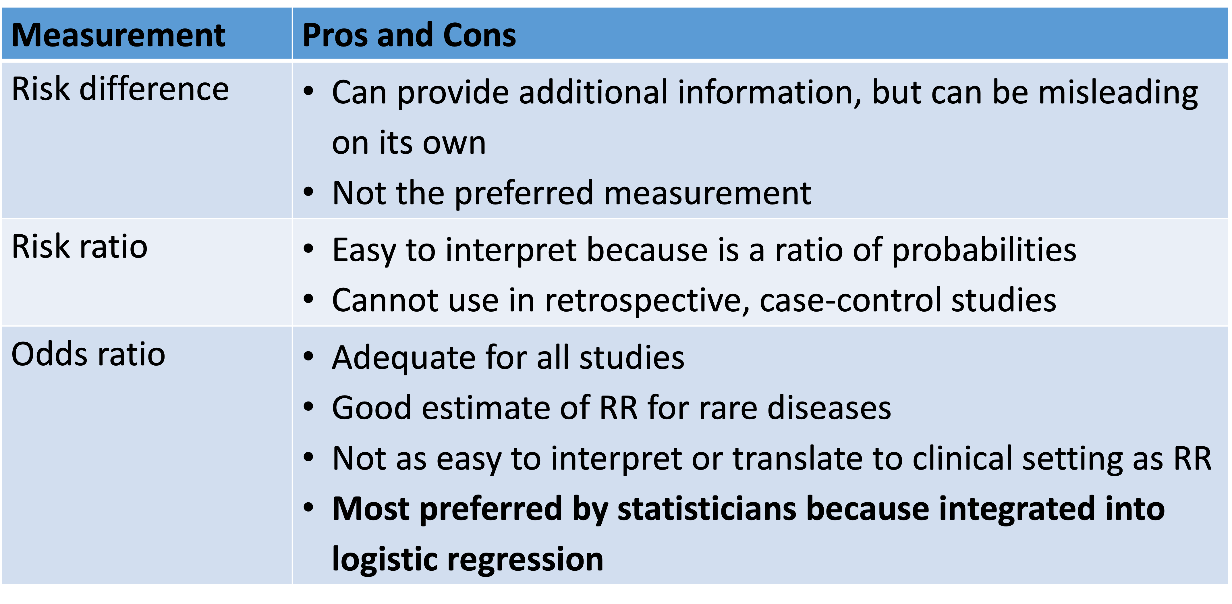 We looked at risk difference, risk ratio, and odds ratio to measure association