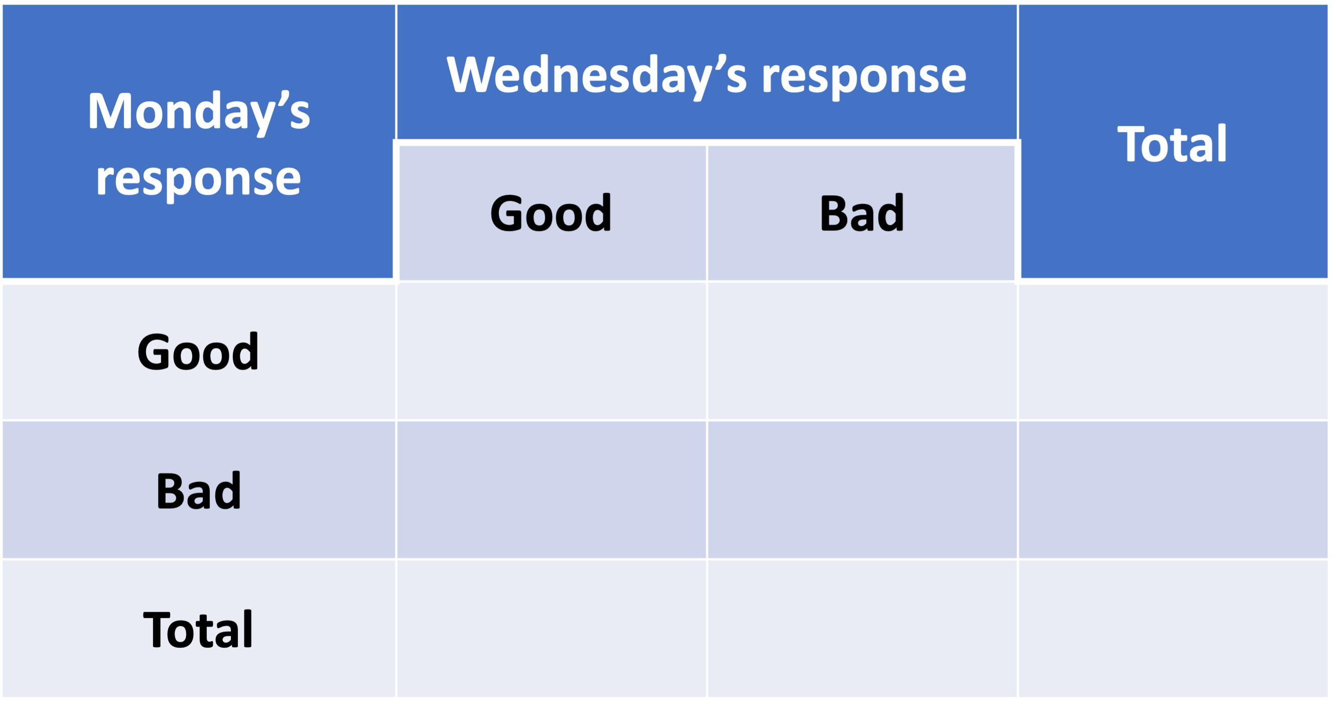 For \(i\) responses (row/columns), \(a_i\) is proportion of \(i\) response category in first survey and \(b_i\) is proportion of \(i\) response category in second survey (we’ll show this in the example)