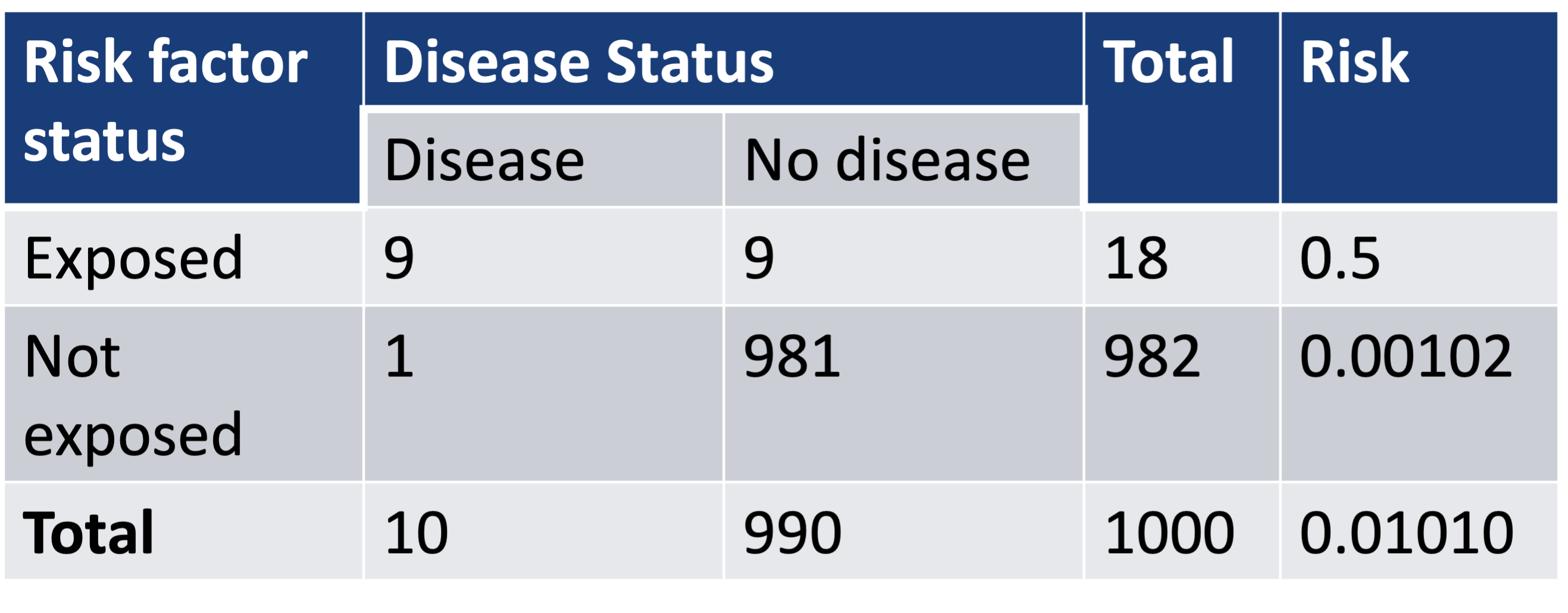 \[\widehat{RR}=\frac{0.5}{0.00102}=490 \text{ and } \widehat{OR} = \frac{0.5(1-0.5)}{0.00102(1-0.00102)}=981\]