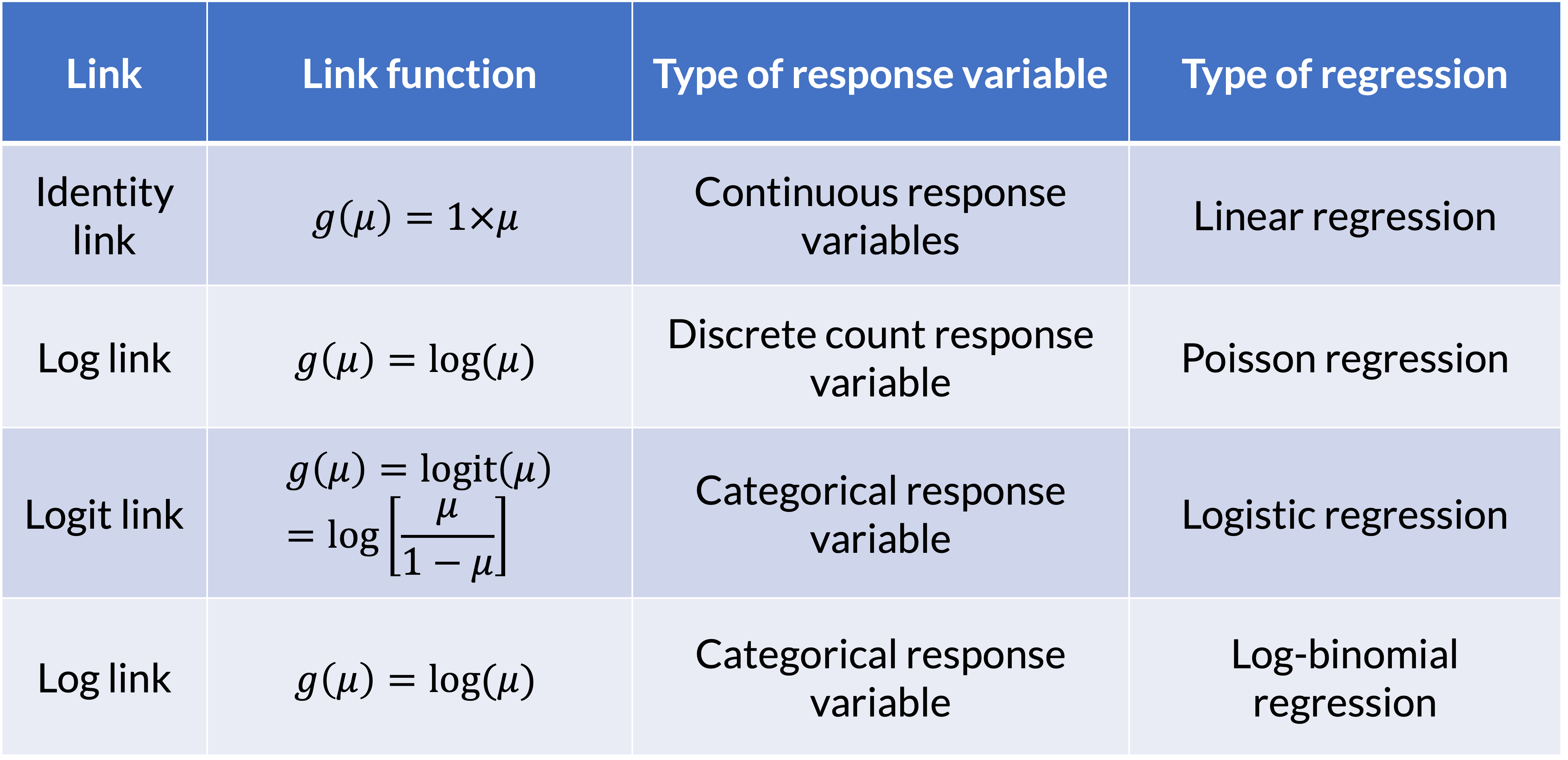 Can also think of this as: \[\mu=g^{-1}\left(\beta_0+\beta_1X_1+\ldots+\beta_kX_k\right)\]