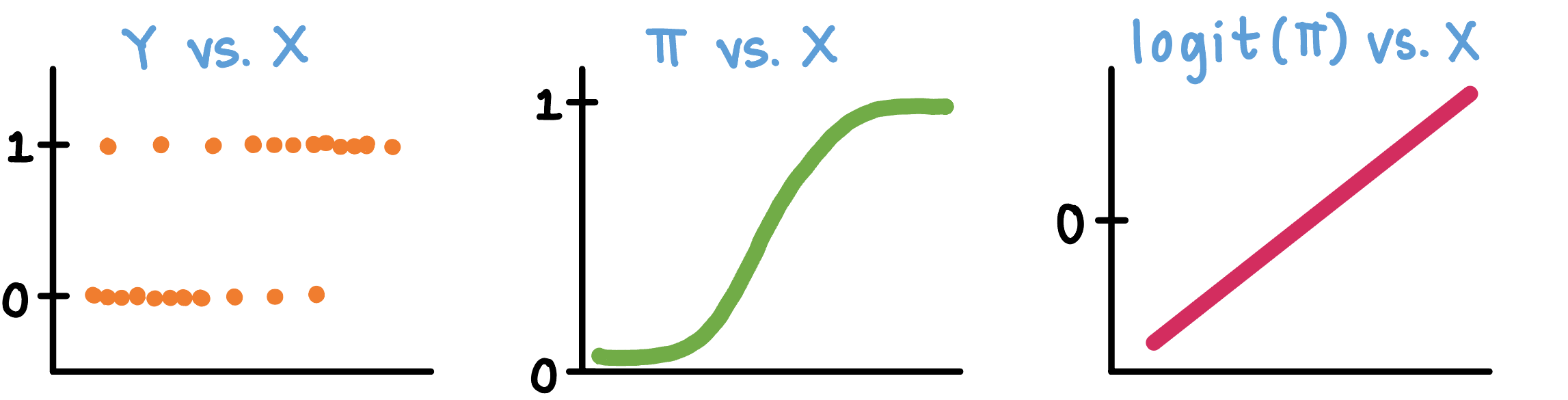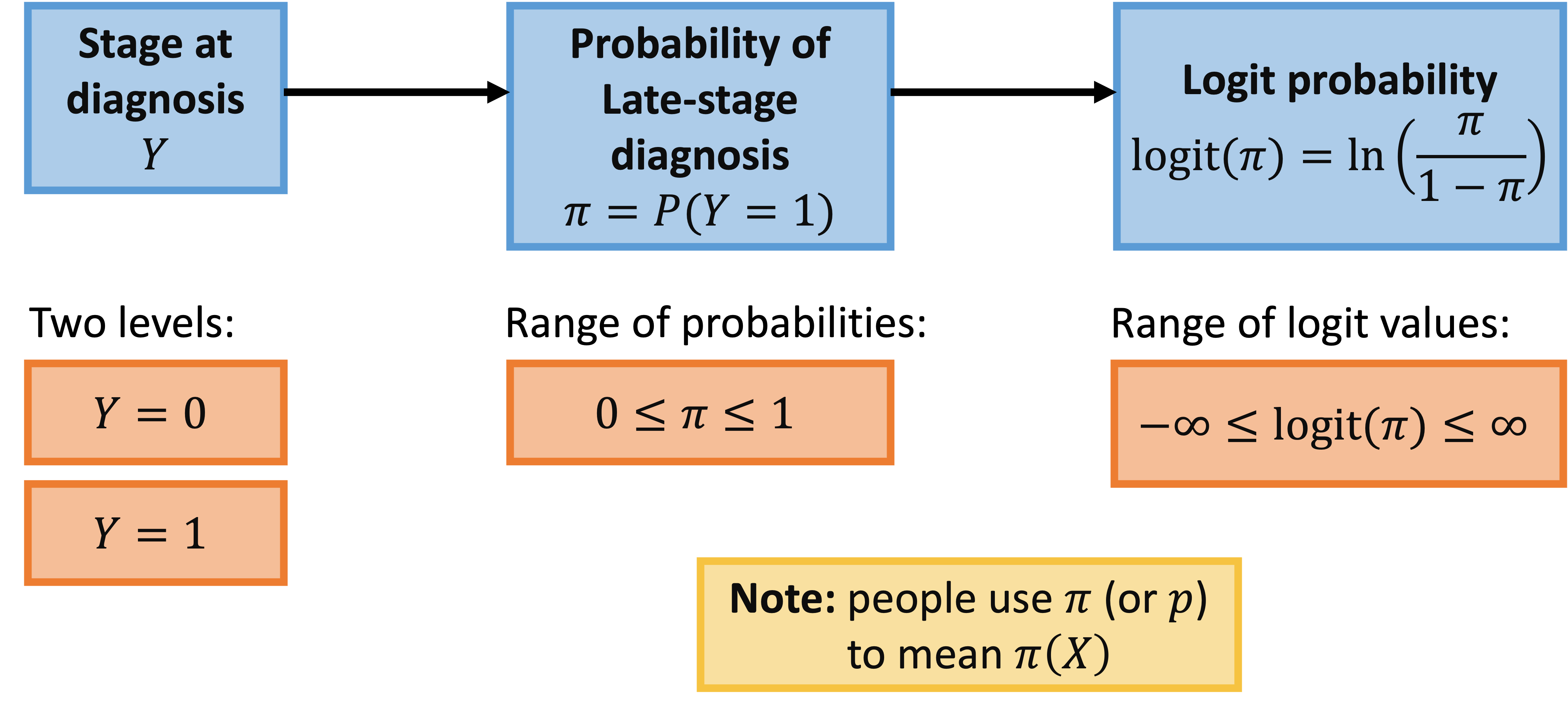 | \(\pi\) | probability that the outcome occurs (\(Y=1\)) given \(X\) |