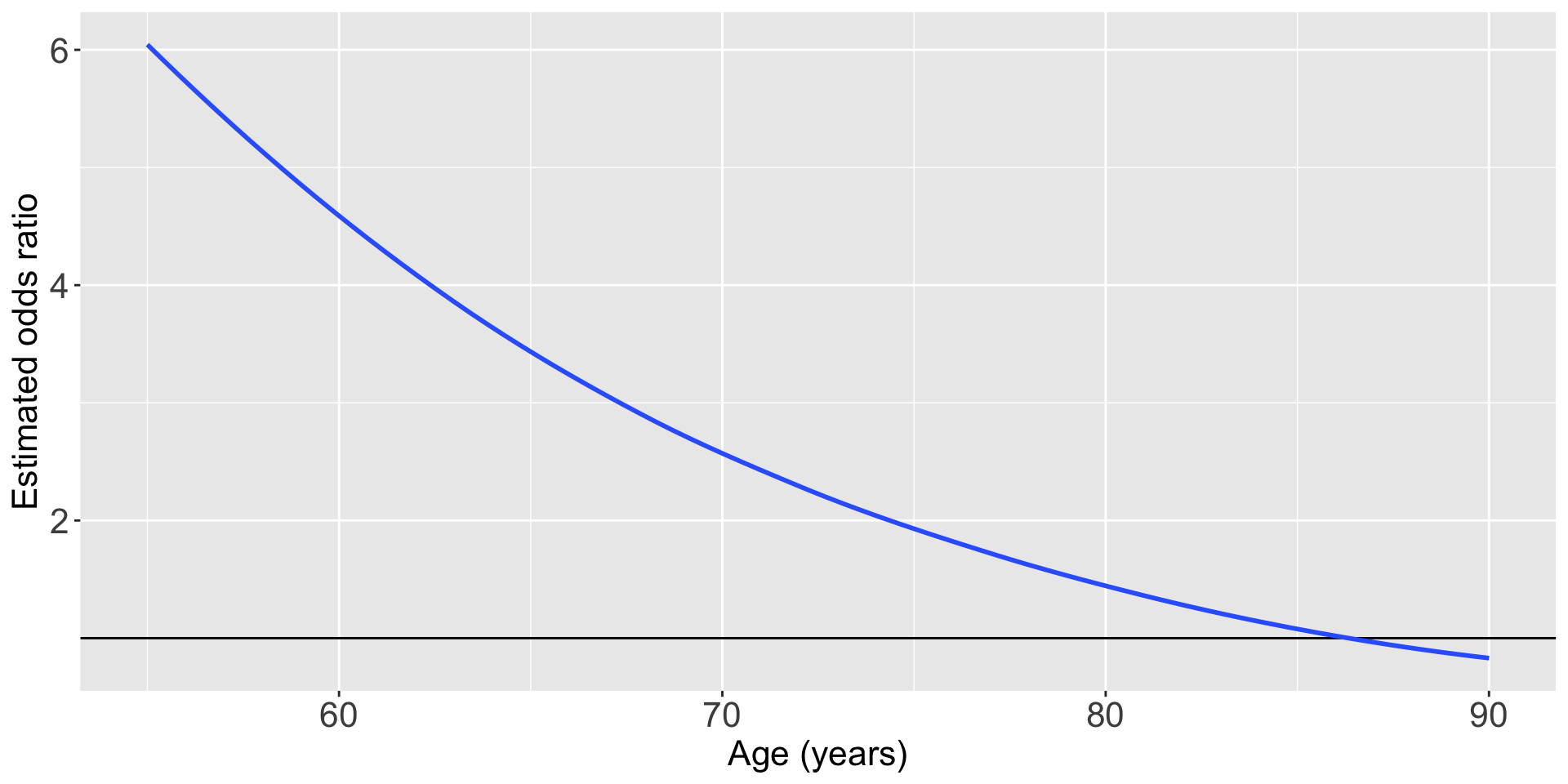 If we let \(a = 60\), i.e., compute OR for age = 60, then \[{\widehat{OR}}_{a=60}=\exp(1.002-0.057\cdot(60-69))\ =4.55\]