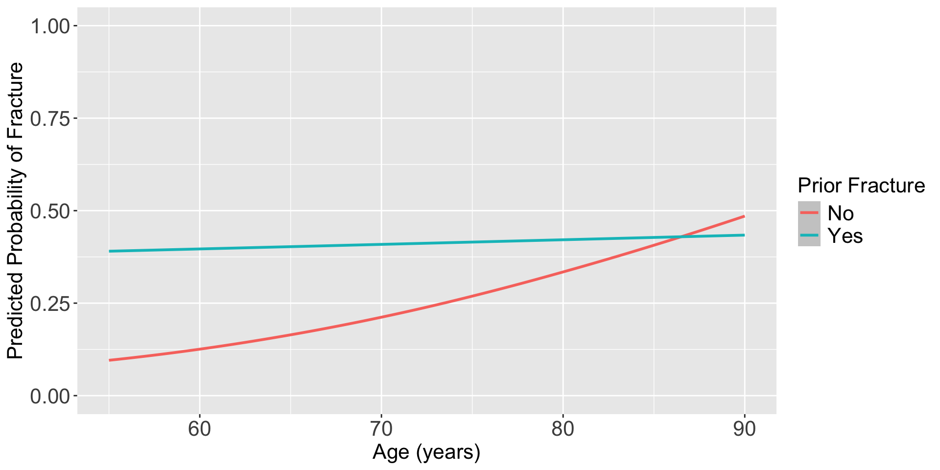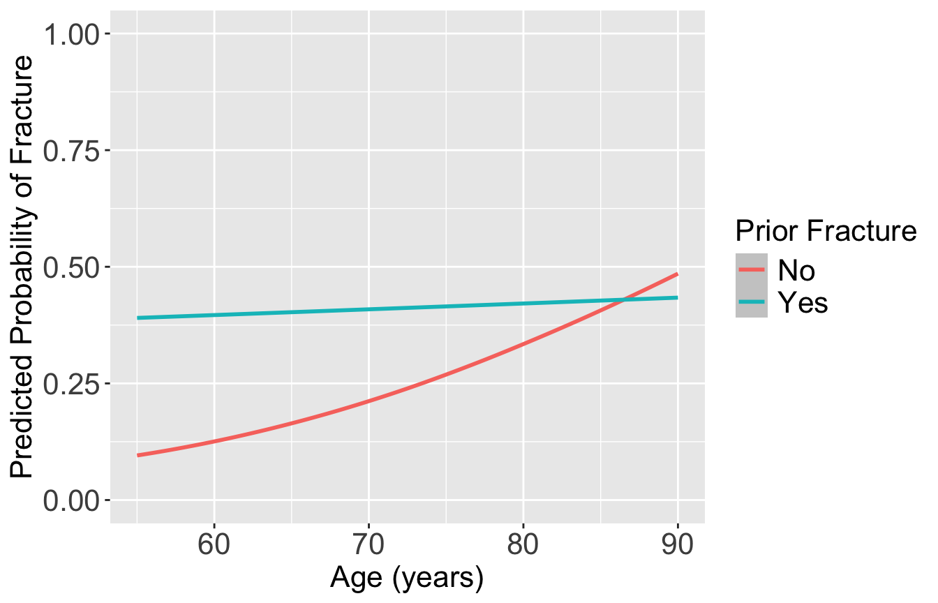 labs(color = "Prior Fracture", x = "Age (years)", y = "Predicted Probability of Fracture")