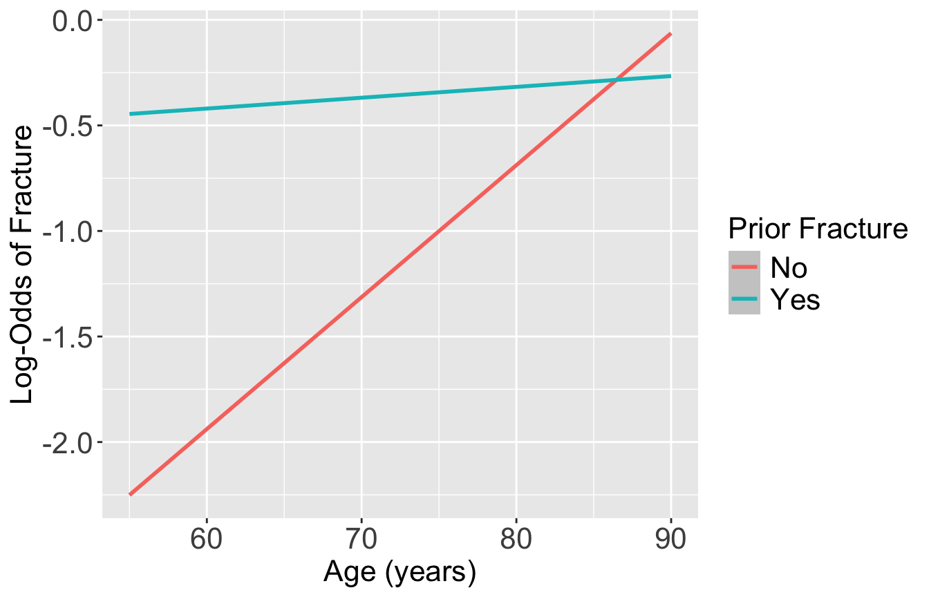 Short version of testing the interaction: Wald statistic for the interaction coefficient, \(\widehat{\beta}_3\), is statistically significant with \(p= 0.022\). Thus, there is evidence of a statistical interaction between these age and prior fracture.