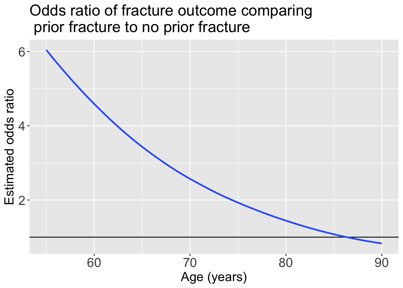 labs(x = "Age (years)", y = "Estimated odds ratio", title = "Odds ratio of fracture outcome comparing \n prior fracture to no prior fracture")For individuals 69 years old, the estimated odds of a new fracture for individuals with prior fracture is 2.72 times the estimated odds of a new fracture for individuals with no prior fracture (95% CI: 1.70, 4.35). As seen in Figure 1 (a), the estimated odds ratio of a new fracture when comparing prior fracture status decreases with age, indicating that the effect of prior fractures on new fractures decreases as individuals get older. In Figure 1 (b), it is evident that for both prior fracture statuses, the predicted probability of a new fracture increases as age increases. However, the predicted probability of new fracture for those without a prior fracture increases at a higher rate than that of individuals with a prior fracture. Thus, the predicted probabilities of a new fracture converge at age [insert age here].