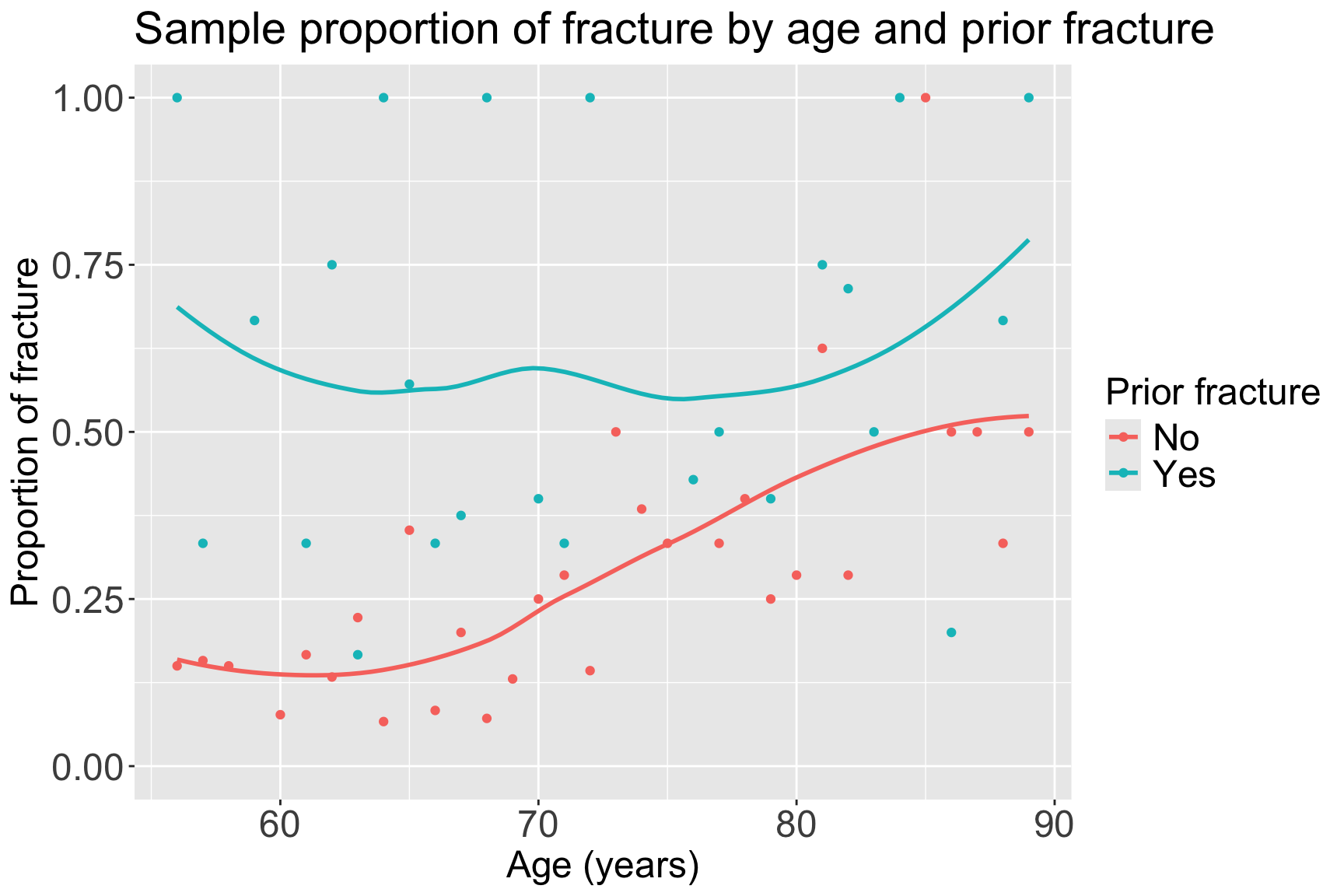 color = "Prior fracture", title = "Sample proportion of fracture by age and prior fracture") +