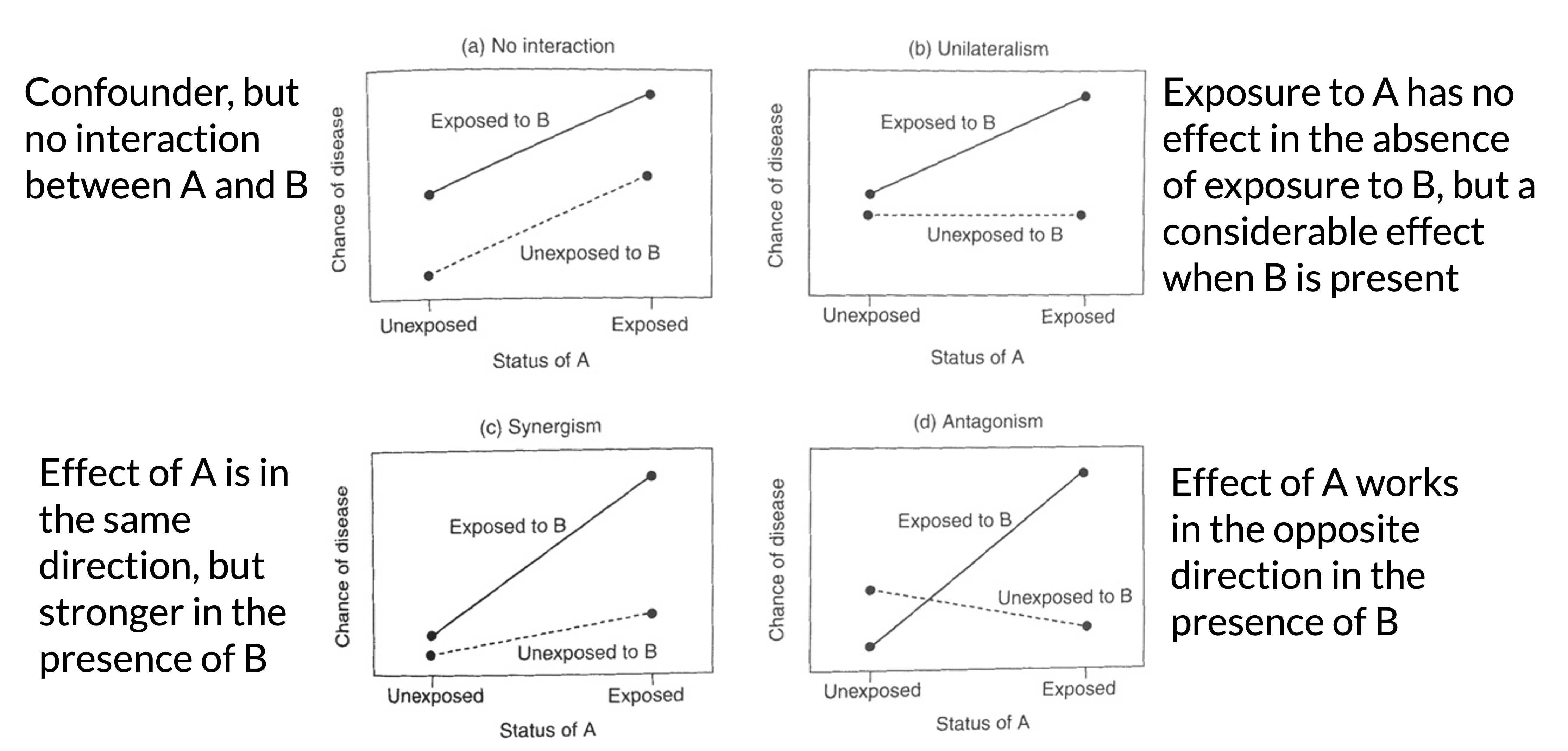No interaction and three potential effects of interaction between two covariates A and B: