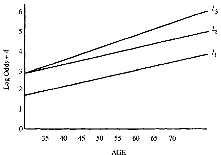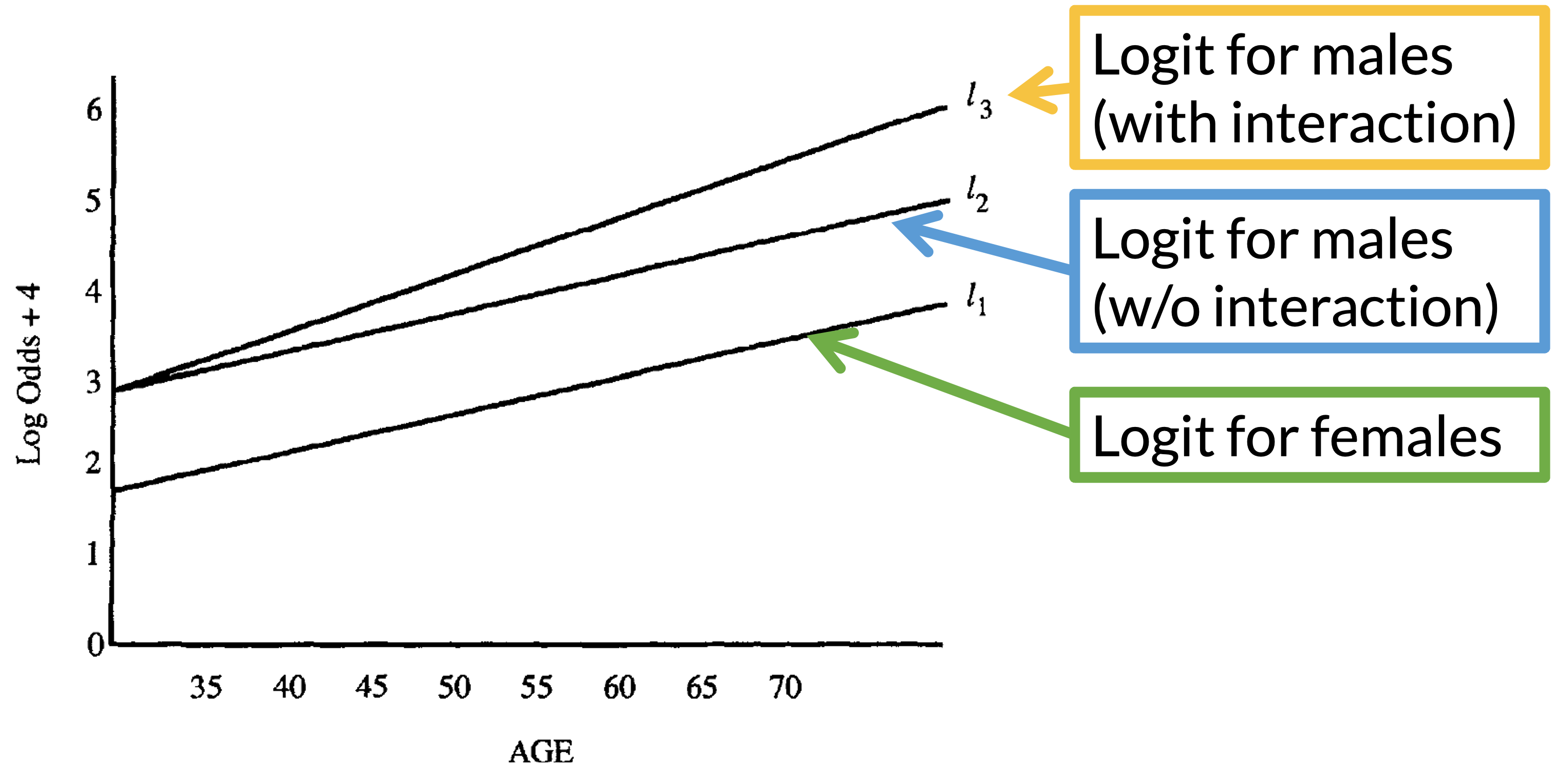 If age interacts with sex, the distance between \(l_3\) and \(l_1\) is the log odds ratio for sex, controlling for age.
