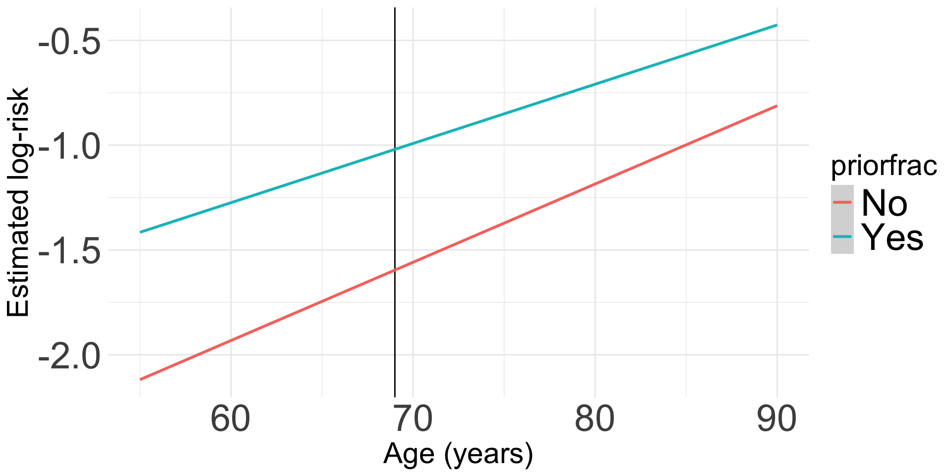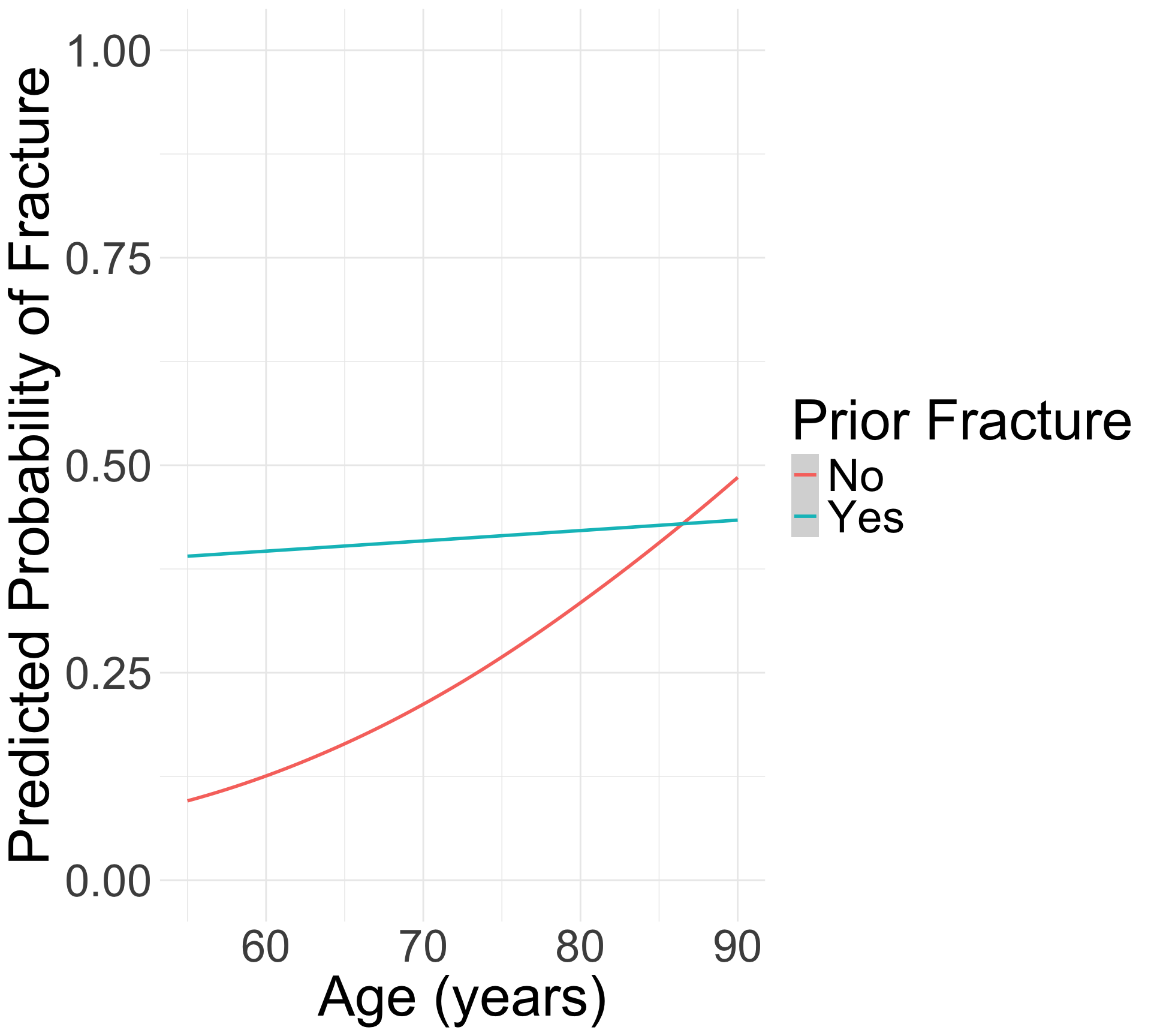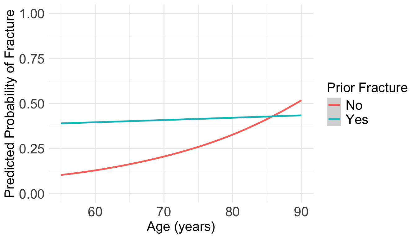 labs(color = "Prior Fracture", x = "Age (years)", y = "Predicted Probability of Fracture")
