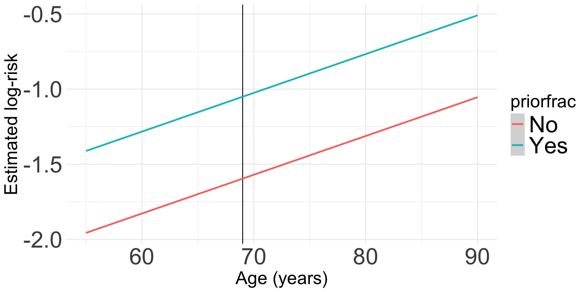 \(\exp(\beta_1)\): The risk of fracture for someone who had a prior fracture is \(\exp(\beta_1)\) times the risk of fracture for someone who did not have a prior fracture, adjusting for age.