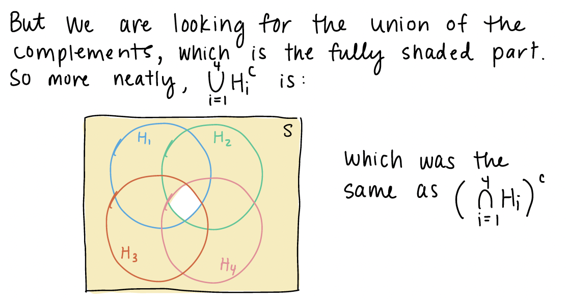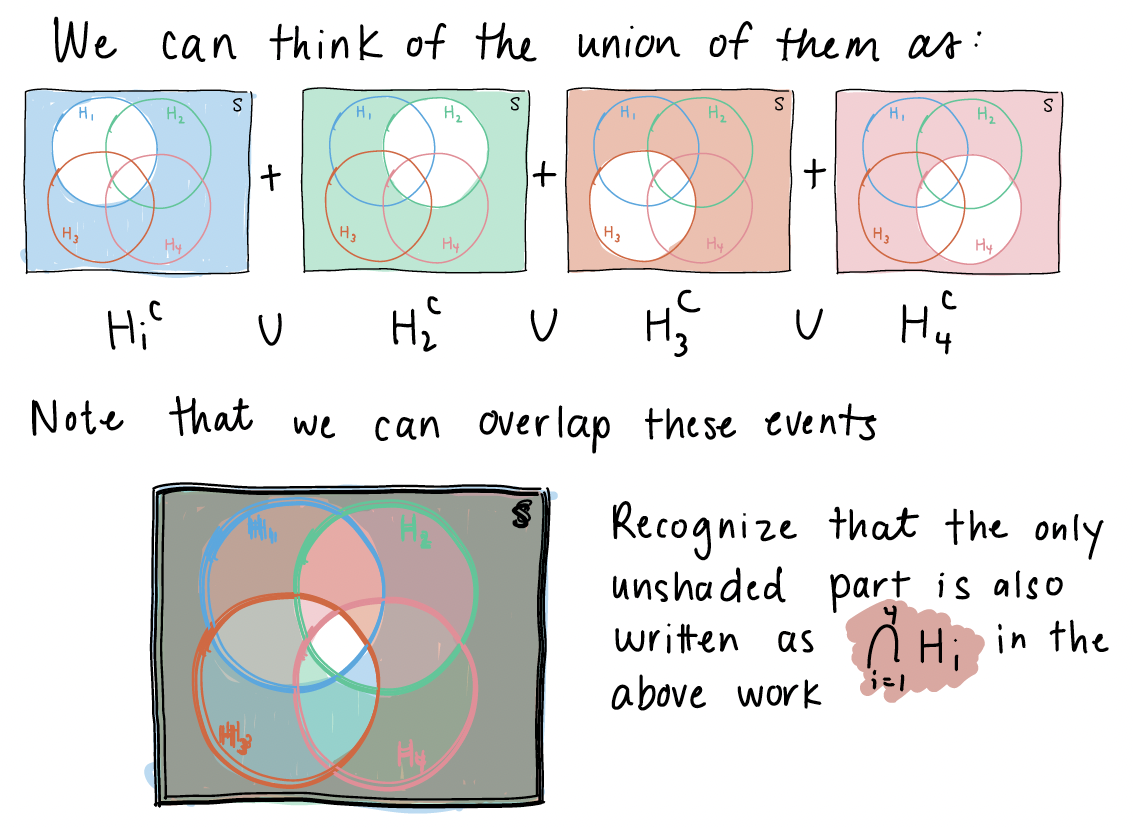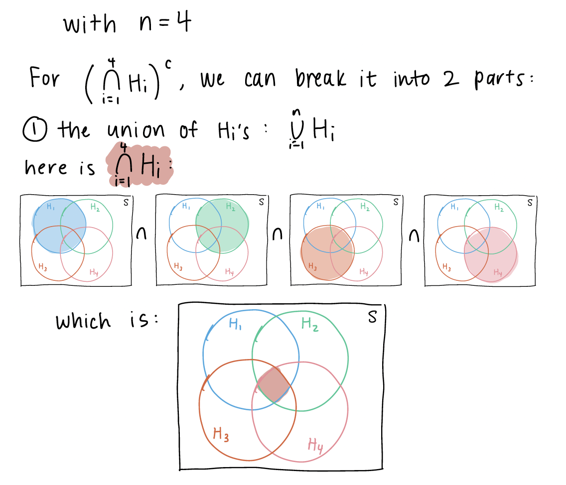 This is in reference to the Lesson 3 notes on “BP example variation (3/3)” slide. I explained the event that at least one subject does not have high blood pressure using a venn diagram. In this venn diagram, I assumed \(n=4\), and I wanted to show that the union of complements is equal to the complement of unions: \(\bigcup\limits_{i=1}^{n}H_i^C = \Big(\bigcap\limits_{i=1}^{n}H_i\Big)^C\), which is De Morgan’s 2nd Law.