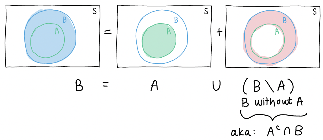 In this proposition, I want to define event \(B\) as a union of disjoint events so that I can show \(P(B)\) is the sum of \(P(A)\) and some greater-than-or-equal-to 0 probability event. If the following is my venn diagram of A and B: