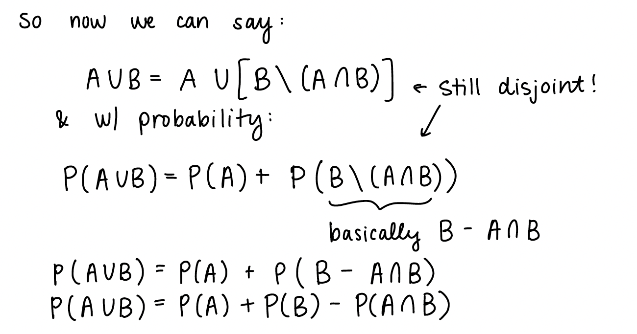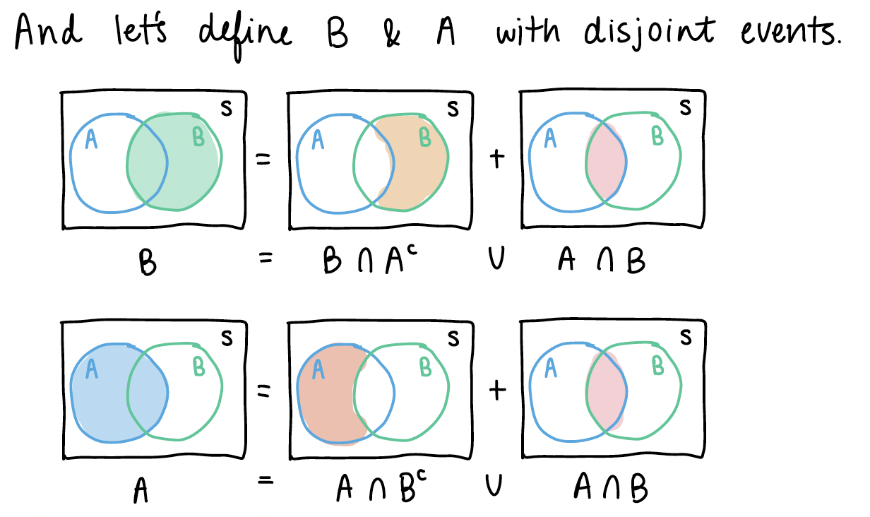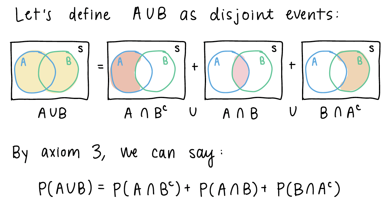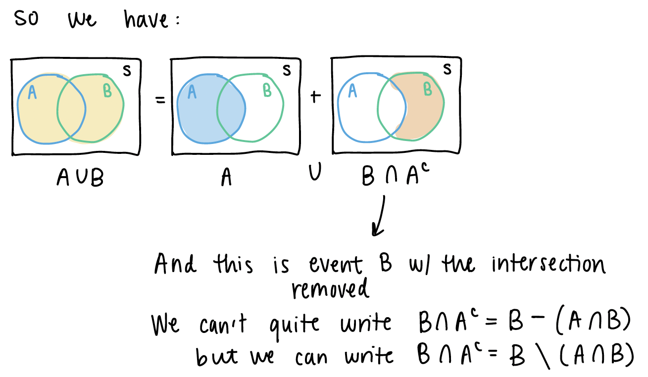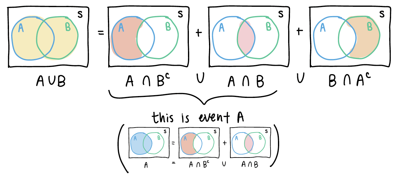Since events \(A\) and \(A^c \cap B\) are disjoint, the probability of their union is just: \[P(A) + P(A^c \cap B)\]