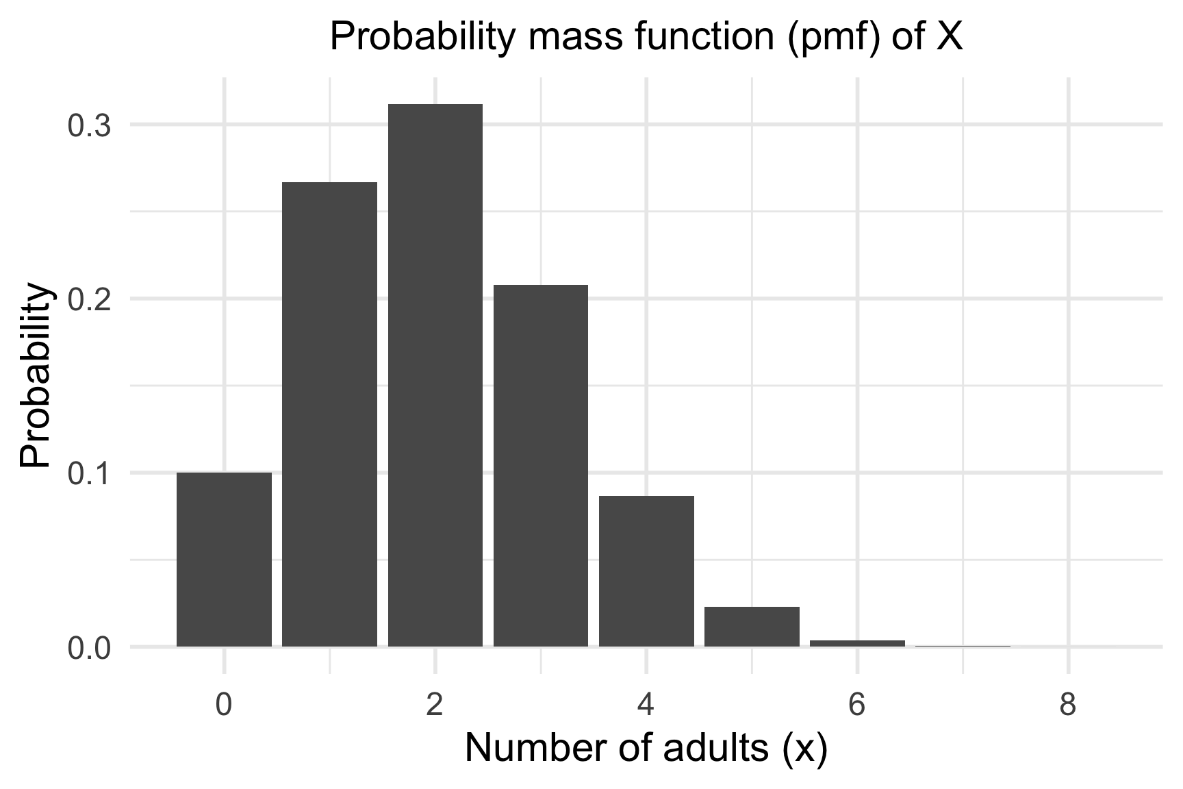 The probability distribution or probability mass function (pmf) of a discrete r.v. \(X\) is defined for every number \(x\) by \[p_X(x) = \mathbb{P}(X=x) = \mathbb{P}(\mathrm{all }\ \omega\in S:X(\omega) = x)\]