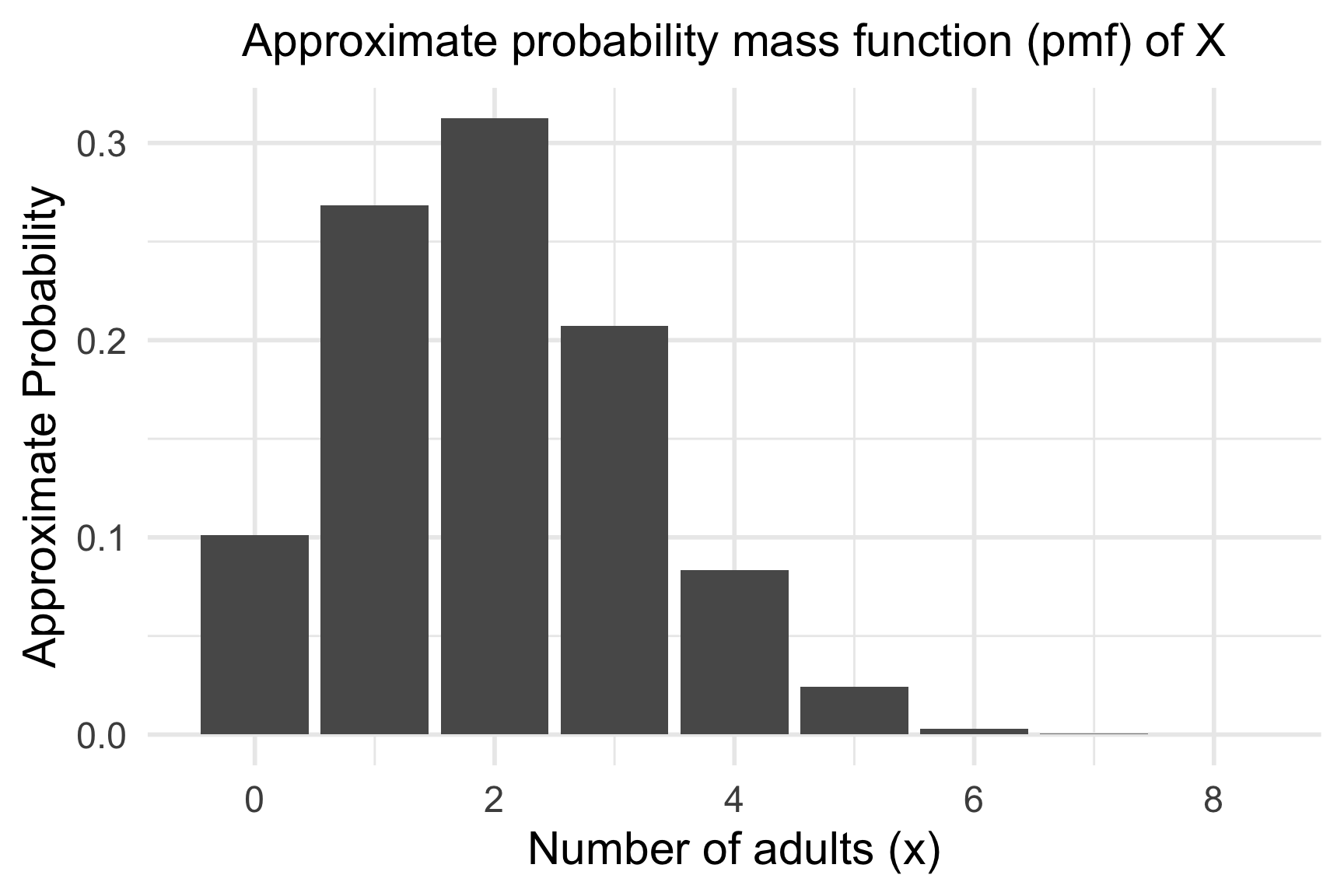 - Simulate \(X\) for 10000 groups and plot the approximated pmf.