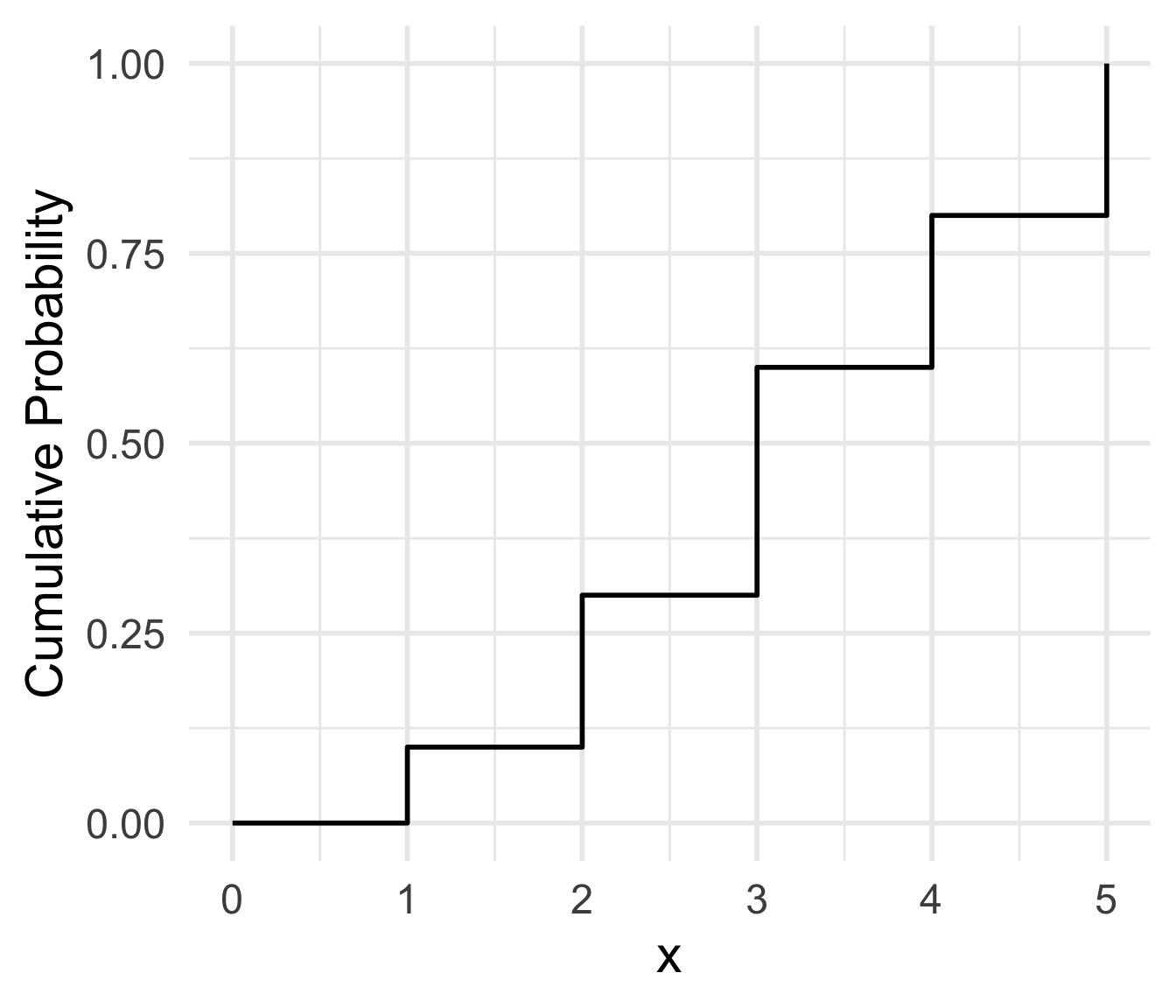 The cumulative distribution function (cdf) of a discrete RV \(X\) with pmf \(p_X(x)\), is defined for every value \(x\) by \[F_X(x) = \mathbb{P}(X \leq x) = \sum \limits_{\{all\ y:\ y\leq x\}}p_X(y)\]