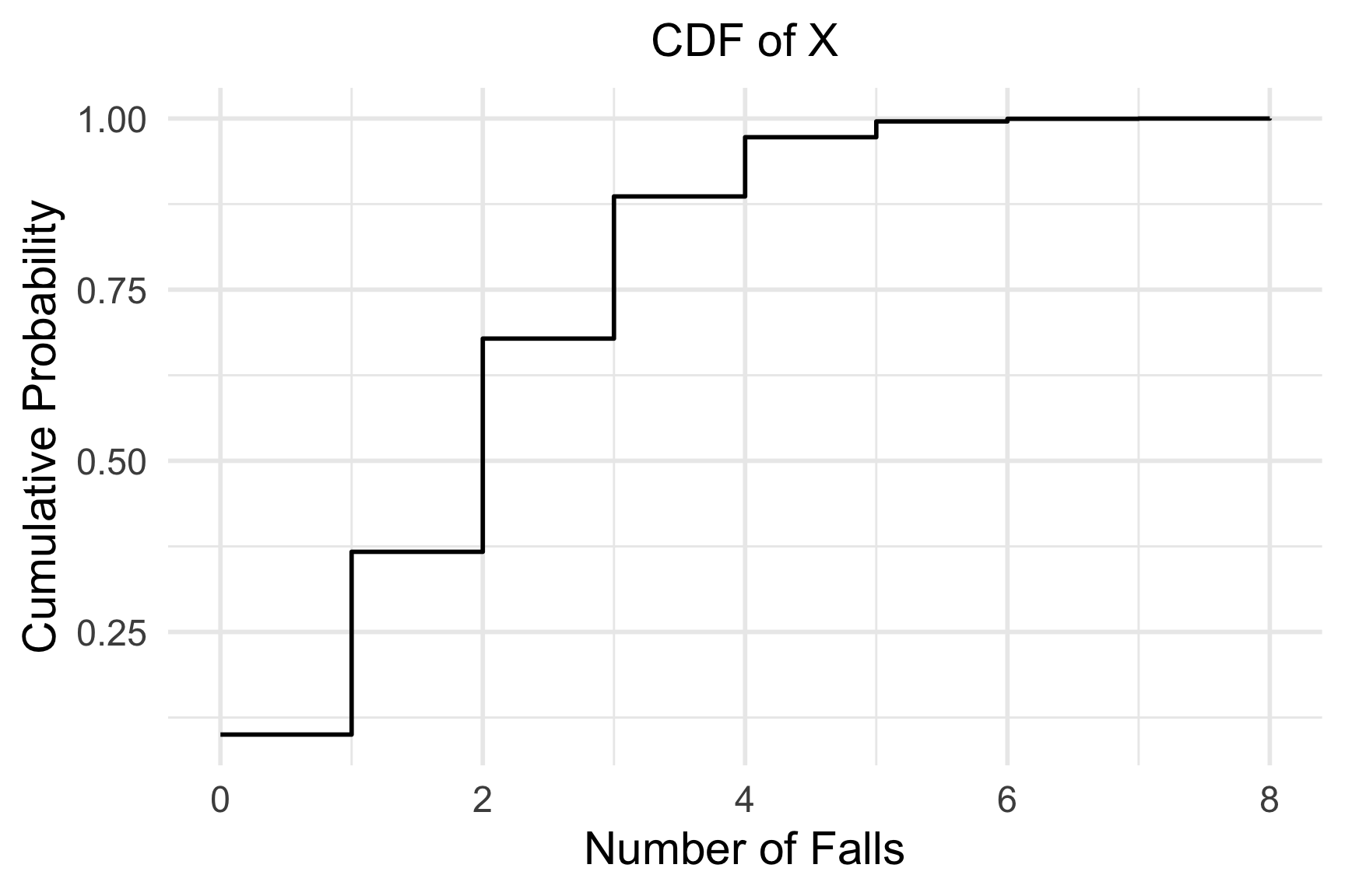 A major public health concern is falls among older adults (age 65+). National data suggests that 25% of older adults will experience at least one fall within a given year. A community health program is tracking a random group of \(n = 8\) older adults for one year. Assume the likelihood of falling is independent from person to person.