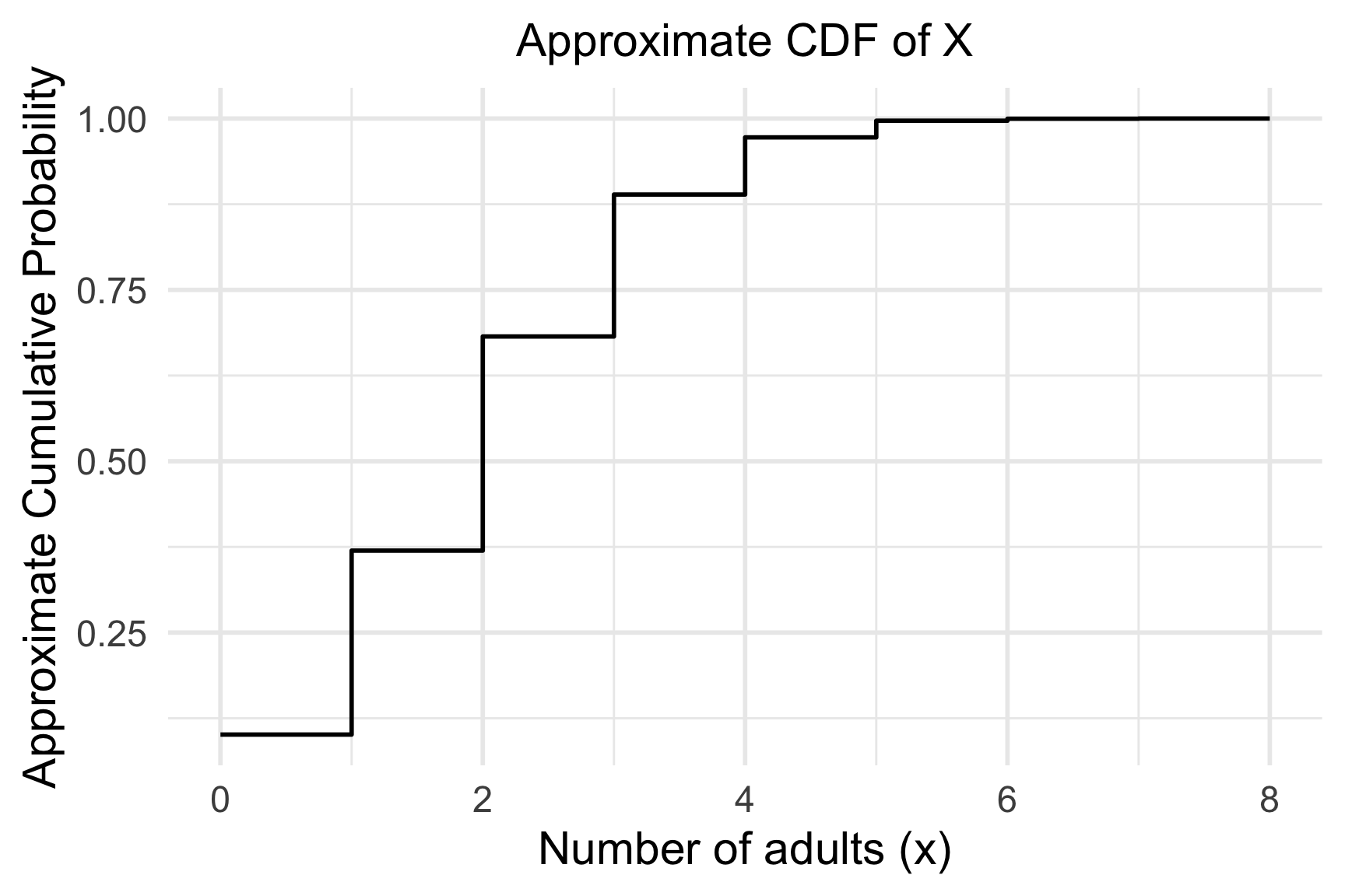 \[F_X(x) = P(X \leq x) = \sum \limits_{k=0}^{x} \binom{8}{k} 0.25^y 0.75^{8-k}\]