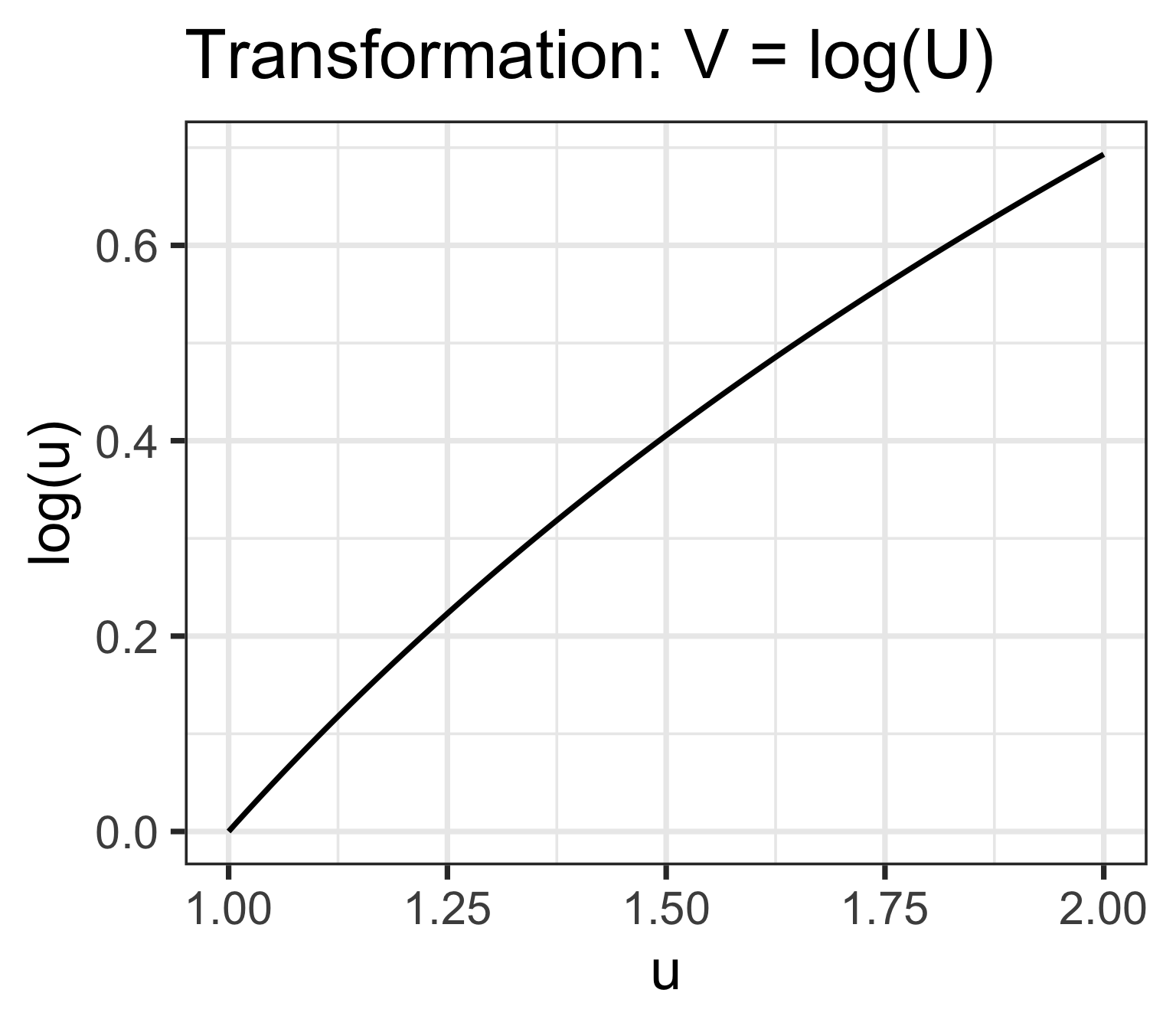 Let \(U\) be a random variable with \(f_U(u)= \dfrac{4}{15}u^3\) for \(1\leq u \leq 2\). Define \(V=\log(U)\)
