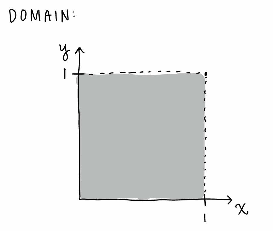 If we wanted to calculate something like \(E(X)\), then we need to account for fact that \(x\) must be less than of equal to \(y\). We can look back at the domain for this: