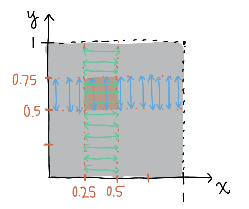 Note the blue lines above indicate how we integrate over \(y\) first from 0.5 to 0.75 and the green lines indicate how integrate over \(x\) first from 0.25 to 0.5. It seems like we’ve integrated over an area that isn’t within our specified probability. However, the integrated area is ONLY the overlap of the \(x\) and \(y\) bounds for the probability.