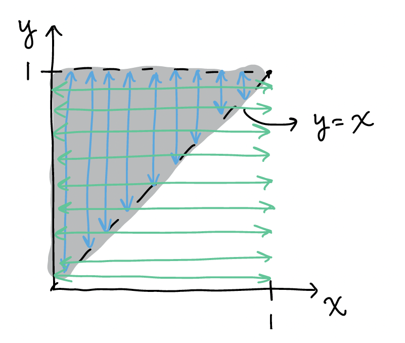 Note the blue lines above still indicate how we integrate over \(y\) first from \(x\) to 1, and the green lines indicate how integrate over \(x\) first from 0 to 1. Once again, it seems like we’ve integrated over an area that isn’t within the domain. However, the integrated area is ONLY the overlap of the \(x\) and \(y\) bounds. Thus, once we’ve restricted \(y\) to the area between \(x\) and 1, we no longer need to restrict \(x\) to the are of 0 to \(y\).