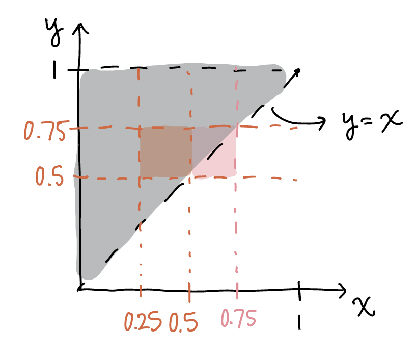 However, if we want the probability \(P(0.5 \leq X \leq 0.75, 0.5 \leq Y \leq 0.75)\), we would focus on the pink area above. We would limit one of our integrals to the \(y=x\) equation: