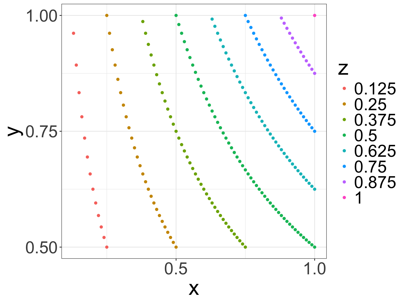 And let’s look at \(P(Z \leq 0.5)\) aka \(P(XY \leq 0.5)\) to get a better sense of the volume needed: