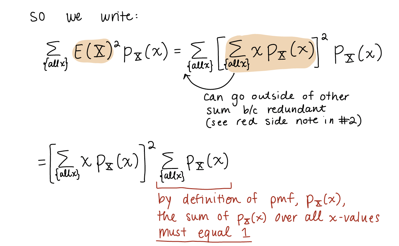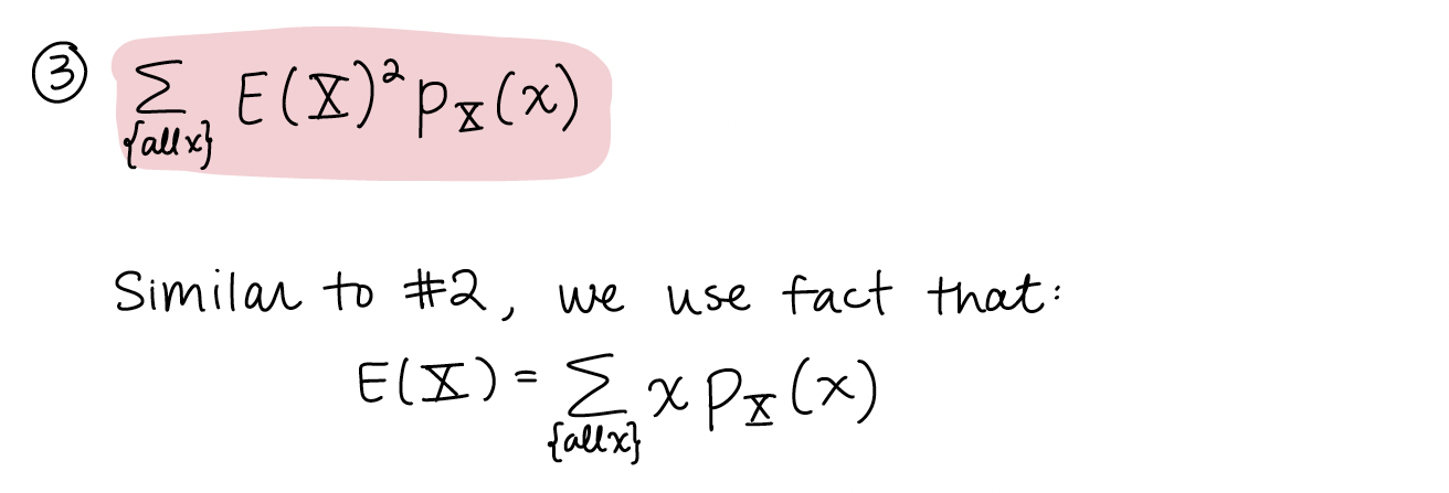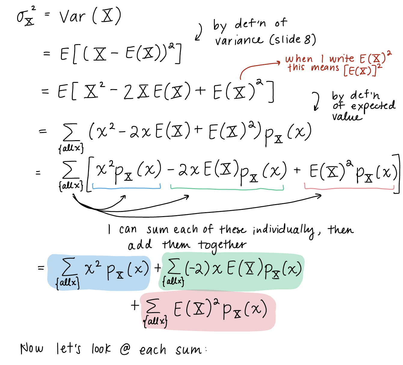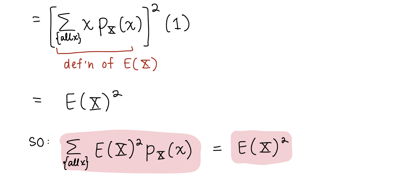 2. The math breakdown of $(X) = E[X^2] - E[X]^2 I’m not sure where the \(X\) value in the term 2 summation \(\mu_xXp_x(x)\) where did \(Xp_x(x)\) go?