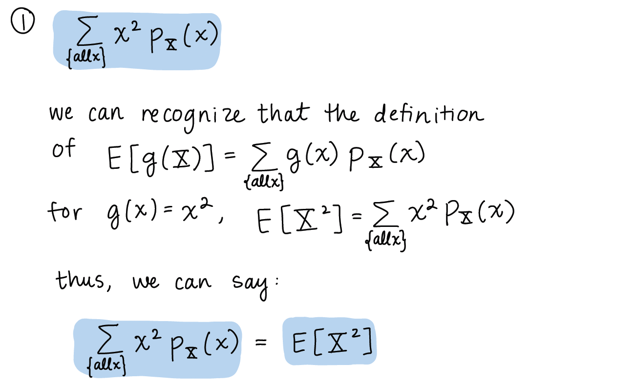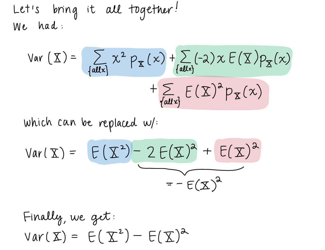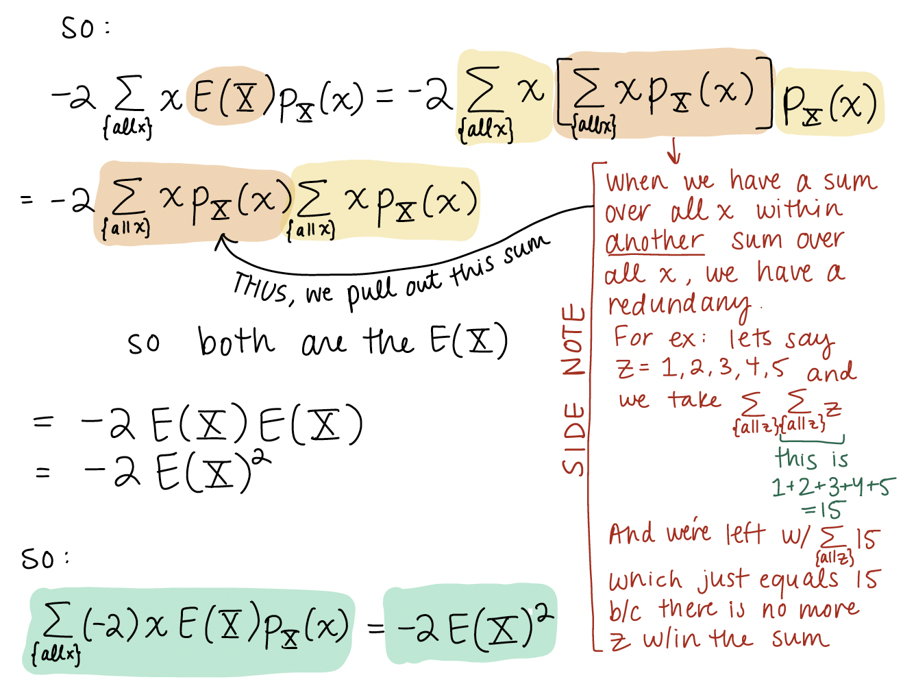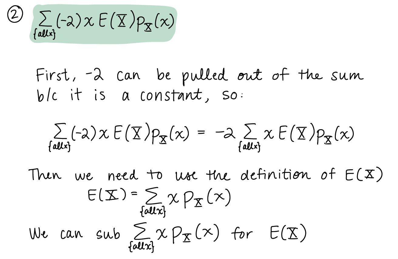 2. The math breakdown of $(X) = E[X^2] - E[X]^2 I’m not sure where the \(X\) value in the term 2 summation \(\mu_xXp_x(x)\) where did \(Xp_x(x)\) go?