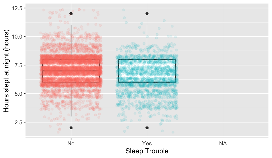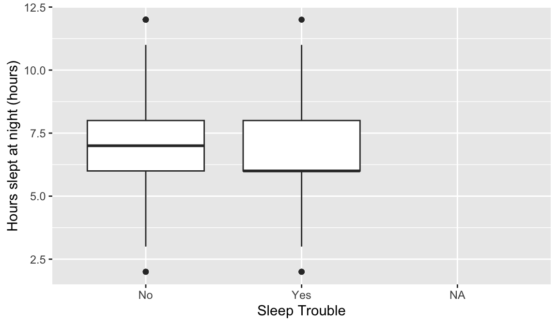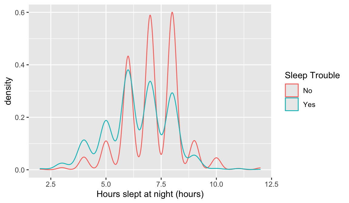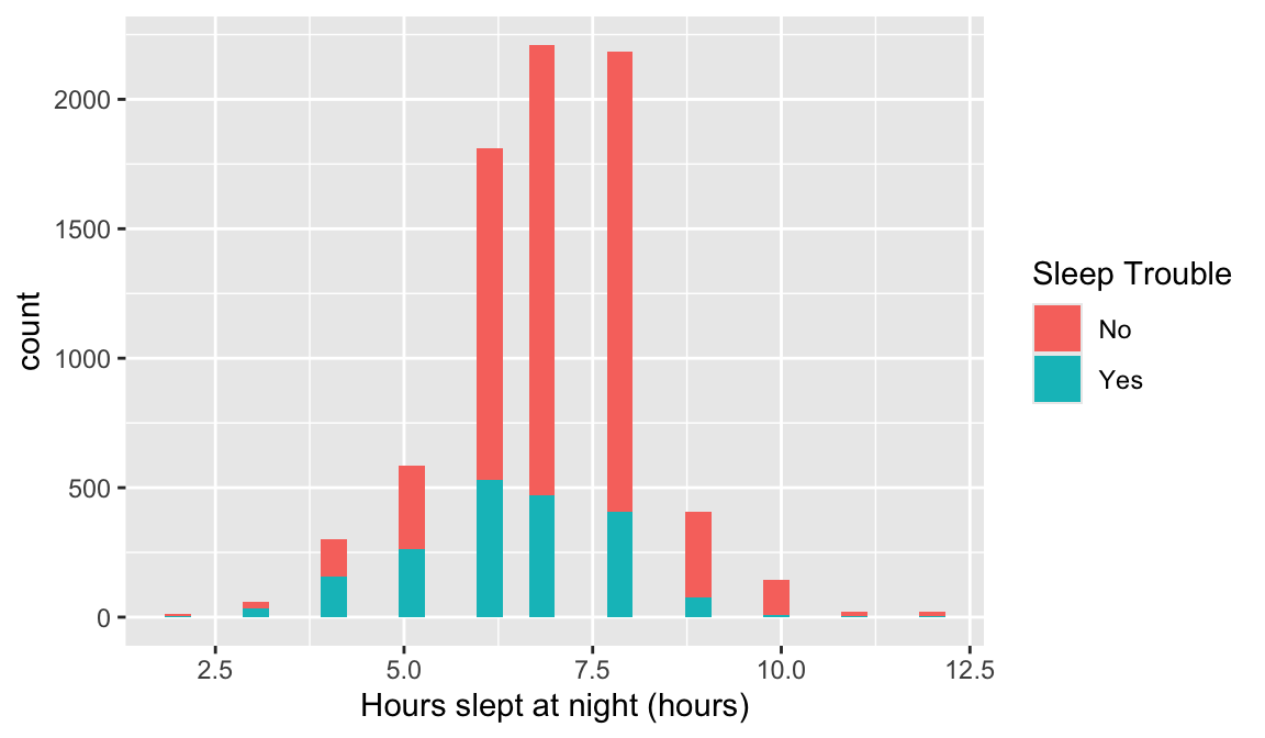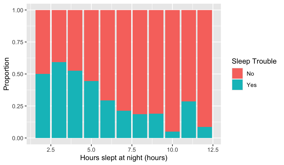 This may require you to use a few options to visualize the data! Also, hours slept is numeric, but there’s only 11 unique values. It might be interesting to try out the visualization methods for two categorical variables.