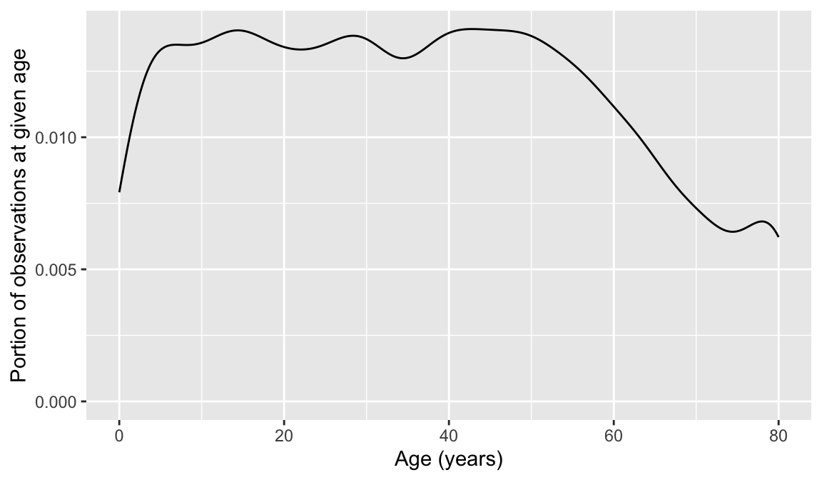 You don’t need to need to use exact stat verbage for this one. Think: is it evenly distributed? Does it trail off? Does it seem like most ages are represented equally? Is there a reason why there’s more 80yo’s than 79 yo’s?