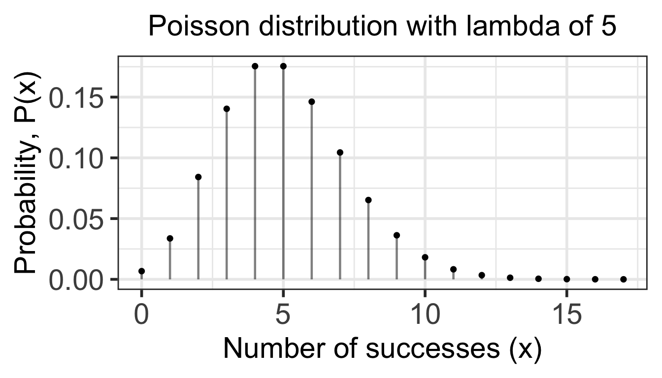 Then the probability of exactly \(x\) events in one unit of time is \[ P(X = k) = \frac{e^{-\lambda}\lambda^{k}}{k!}, \,\, k = 0, 1, 2, \ldots \]