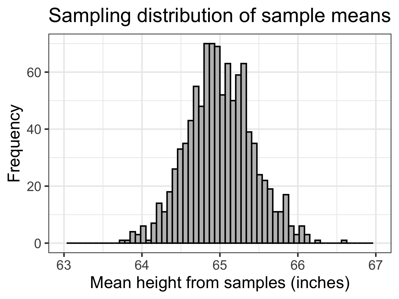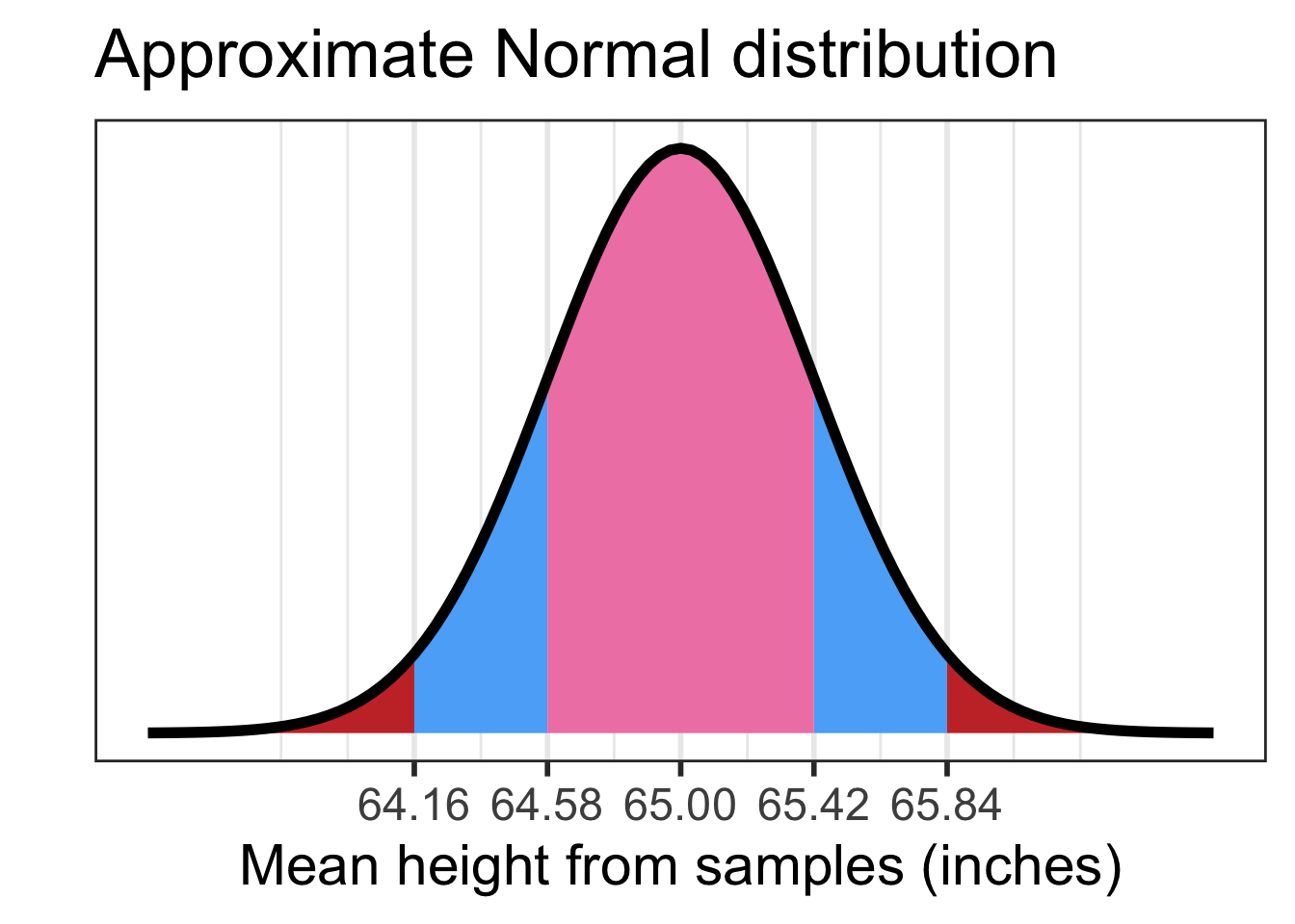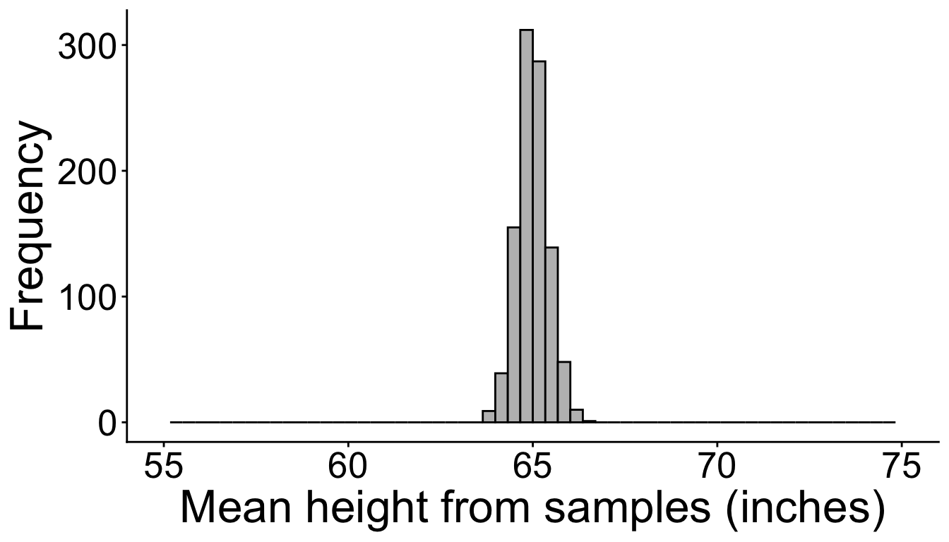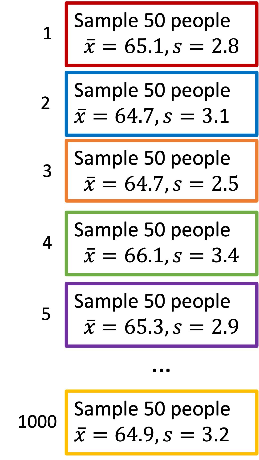\[ \mu_{\overline{X}} = 65.002 \text{ inches}\] \[ SE = 0.421 \text{ inches}\]